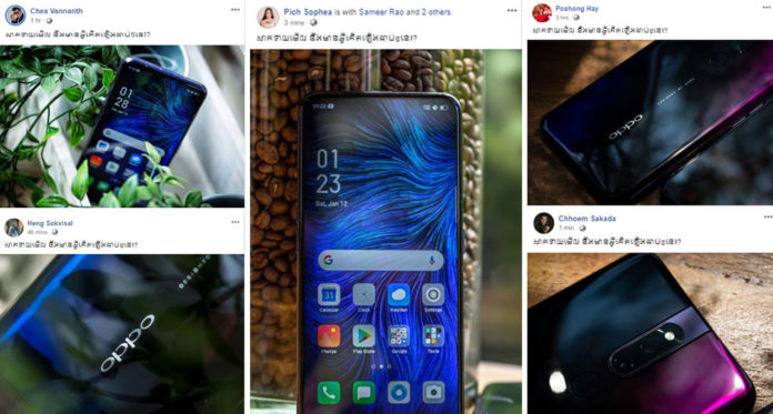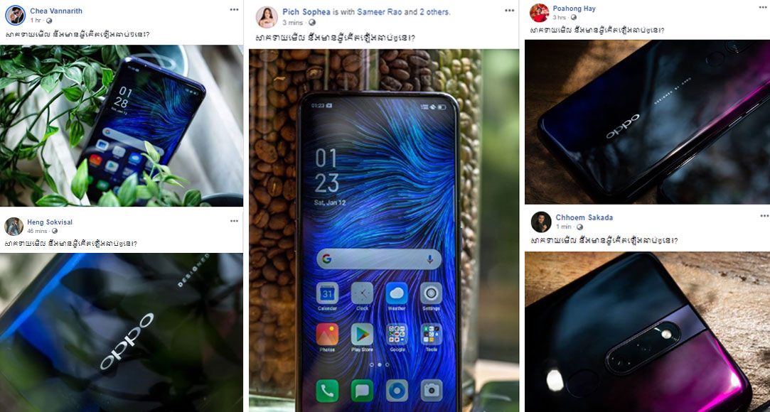 អ្នកទាំងអស់គ្នាមានឆ្ងល់ដូចយើងឬអត់ ថាហេតុអ្វីបានជាក្រុមហ៊ុនមិនព្រមបង្ហាញរូបរាងពិតនៃទូរស័ព្ទនេះអញ្ចឹង? តើវាជាទូរស័ព្ទថ្មីម៉ូឌែល F11 ឬ F11 Pro? ហើយតើវានឹងមកដល់កម្ពុជា នៅពេលណា? ប៉ុន្តែជាធម្មតា តាមការសង្កេតរបស់យើងខ្ញុំ ឃើញថា ក្រោយពេលដែលតារាក្នុងស្រុកបង្ហោះរូបភាពបែបនេះ តាមរយៈបណ្តាញសង្គមហើយនោះ គឺមិនយូរទេ វានឹងមកដល់ហើយ ជាពិសេសក្នុងសកម្មភាពនោះ គឺមានតារាចម្រៀងល្បីៗ និងពេញនិយមរួមមាន អ្នកនាងពេជ្រ សោភា, កញ្ញារ៉េត ស៊ូហ្សាណា និងលោក Step ដែលយើងគ្រប់គ្នាស្គាល់ច្បាស់ថាជា Brand Ambassador របស់ក្រុមហ៊ុន OPPO ប្រចាំនៅកម្ពុជា នោះ ក៏បានបង្ហោះរូបភាព និងអត្ថន័យដូចគ្នាដែរ។