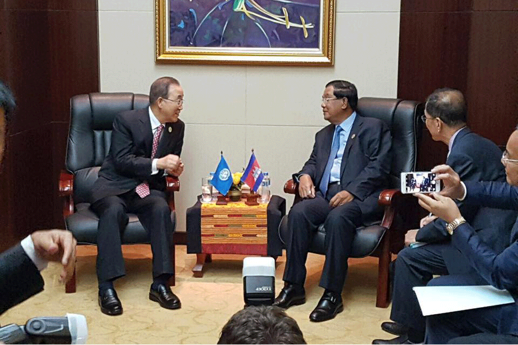 ជំនួបទ្វេភាគីរវាងសម្តេចនាយករដ្ឋមន្ត្រី ហ៊ុន សែន ប្រមុខរាជរដ្ឋាភិបាលកម្ពុជា និង លោកបាន គីមូន អគ្គលេខាធិការអង្គការសហប្រជាជាតិ បានធ្វើឡើងកាលពីថ្ងៃទី០៦ ខែកញ្ញា ឆ្នាំ២០១៦។ ចំណែកបញ្ហាដែលលើកយកមក ពិភាក្សាមាន៣ចំណុចសំខាន់ៗ ក្នុងនោះរួមមាន ទី១ការប្រែប្រួលអាកាសធាតុ ទី២ការបញ្ជូន កម្លាំងរបស់កម្ពុជា ចូលរួមកងរក្សាសន្តិភាព អង្គការសហប្រជាជាតិ និងទី៣ការស្វែងរក ហិរញ្ញវត្ថុសម្រាប់បន្តសាលាក្តីខ្មែរក្រហម។