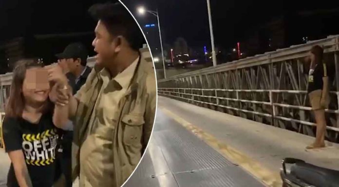 ចំណែកនារីខាងលើឈររេរាទាមទារអង្គុយលេងលើស្ពានតែម្នាក់ឯង ប៉ុន្តែត្រូវបានក្រុមសន្តិសុខមិនទុកចិត្តក៏ចាប់អូសដៃឱ្យឡើងជិះម៉ូតូ រួចដឹកចុះពីលើមកដាក់នៅក្នុងម៉ាតក្នុងស្ថានីយប្រេងមួយកន្លែង ដើម្បីឱ្យសម្រួលអារម្មណ៍ មុននឹងត្រឡប់ទៅផ្ទះវិញ។/