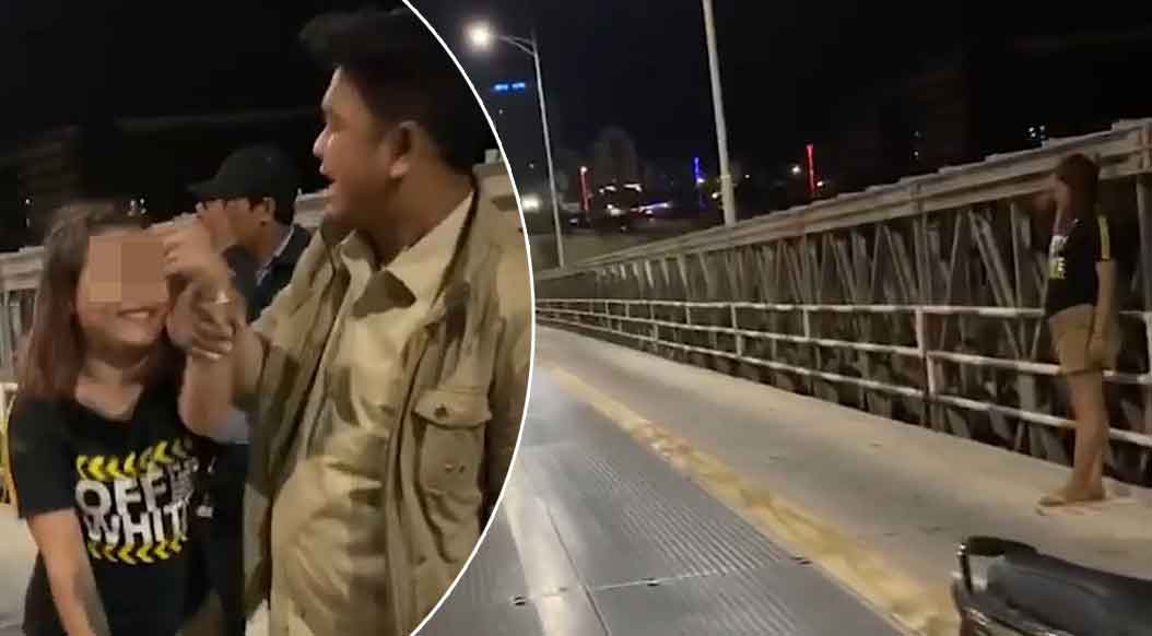ភ្នំពេញ ៖ គូស្នេហ៍វ័យក្មេងមួយគូមិនដឹងជាមានបញ្ហាអ្វីនឹងគ្នា ក៏ស្រាប់តែជិះម៉ូតូដឹកគ្នាតាមផ្លូវសុខៗ ក៏ឈប់ម៉ូតូឈ្លោះប្រកែកគ្នាមួយប៉្រាវ ធ្វើឱ្យខាងស្រីមួម៉ៅក្តៅចិត្តក៏រត់ឡើងទៅលើស្ពានបាឡេ លោតទឹកបំណងសម្លាប់ខ្លួន តែសំណាងល្អធ្លាក់ទើលើសំណាញ់និងត្រូវបានក្រុមសន្តិស៊ិខជួយសង្គ្រោះទាន់ពេល ចំណែកខាងប្រុសវិញឃើញសភាពបែបនេះក៏ជិះម៉ូតូគេចចេញទៅបាត់ស្រមោល។