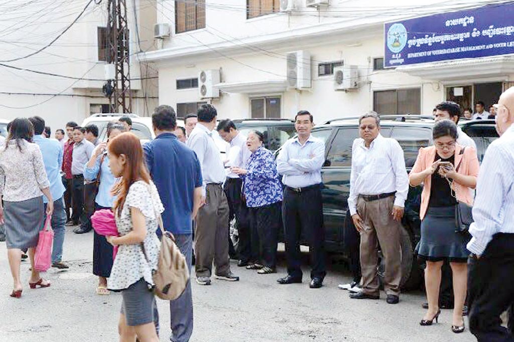 ភ្នំពេញ ៖ ថ្នាក់ដឹកនាំនិងមន្ត្រីគណៈកម្មការជាតិរៀបចំការបោះឆ្នោត (..) បាន នាំគ្នារត់ចេញពីបន្ទប់ប្រជុំ ទាំងព្រលឹងចុងសក់ បន្ទាប់ពីភ្ញាក់ផ្អើល នឹងករណីផ្ទុះឥដ្ឋការ៉ូ ក្នុងបន្ទប់ ប្រជុំ ដោយសារភ័យខ្លាចអគារបាក់ស្រុត។