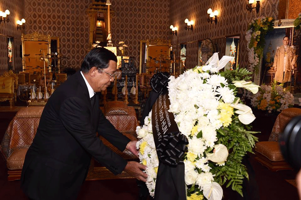 យោងតាមទំព័រហ្វេសប៊ុកផ្លូវការរបស់ សម្តេចនាយករដ្ឋមន្ត្រីហ៊ុន សែន បានបញ្ជាក់ឱ្យ ដឹង កាលពីព្រឹកថ្ងៃទី២២ ខែតុលា ឆ្នាំ២០១៦ ថា “សម្តេចនាយករដ្ឋមន្ត្រីហ៊ុន សែន អញ្ជើញ ទៅគោរពវិញ្ញណក្ខន្ធព្រះមហាក្សត្រថៃ នៅ ទីក្រុងបាងកក ប្រទេសថៃ។