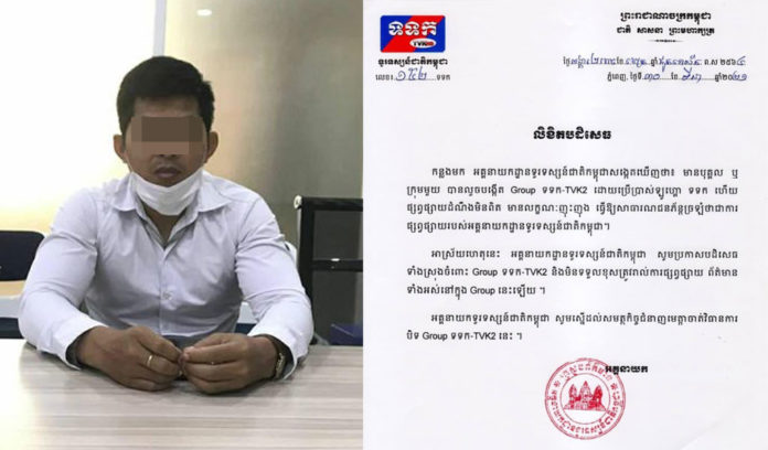ភ្នំពេញ ៖ បុរសម្នាក់បង្កើតគណនីហ្វេសប៊ុកក្លែងក្លាយ ប្រើប្រាស់ឈ្មោះ និងឡូហ្គូរបស់ទូរទស្សន៍ជាតិកម្ពុជា (ទទក) ហើយផ្សព្វផ្សាយព័ត៌មានមិនពិត ត្រូវបានកម្លាំងស្នងការដ្ឋាននគរបាលរាជធានីភ្នំពេញ ឃាត់ខ្លួនមកសួរនាំ និងធ្វើកិច្ចសន្យាអប់រំបញ្ឈប់សកម្មភាព។