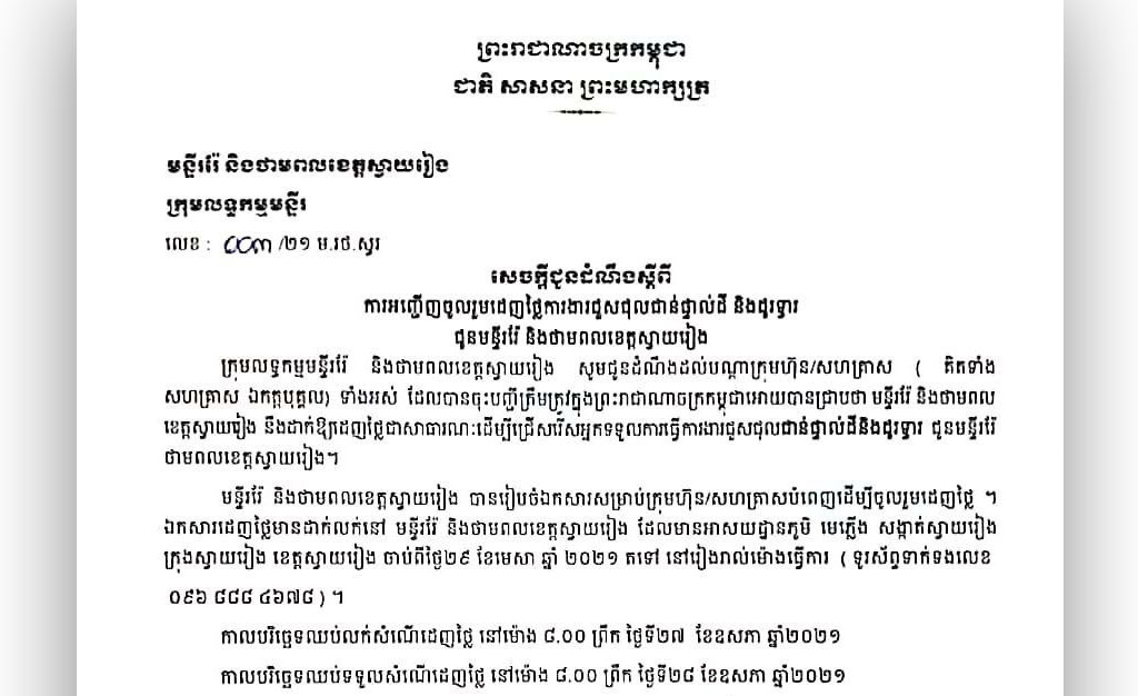 សេចក្តីជូនដំណឹង ស្តីពី ការអញ្ជើញចូលរួមដេញថ្លៃការងារជួសជុលជាន់ផ្ទាល់ដី​ និងដូរទ្វារជូនមន្ទីររ៉ែ និងថាមពលខេត្តស្វាយរៀង