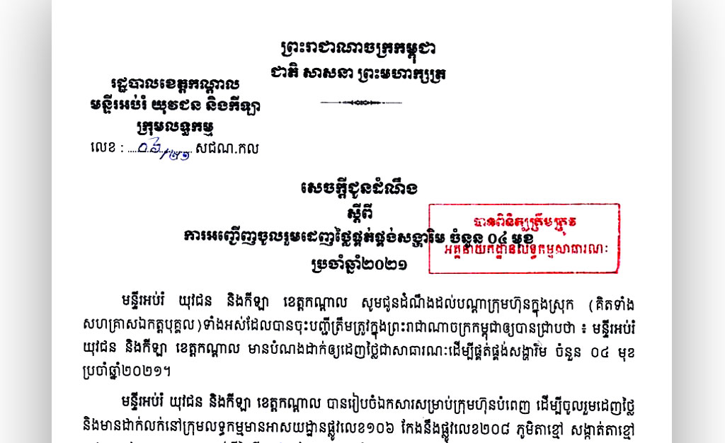 សេចក្តីជូនដំណឹង ស្តីពី​ ការ​អញ្ជើញ​ចូលរួម​ដេញថ្លៃ​ផ្គត់ផ្គង់សង្ហារិម ចំនួន​ 4មុខ ប្រចាំឆ្នាំ2021