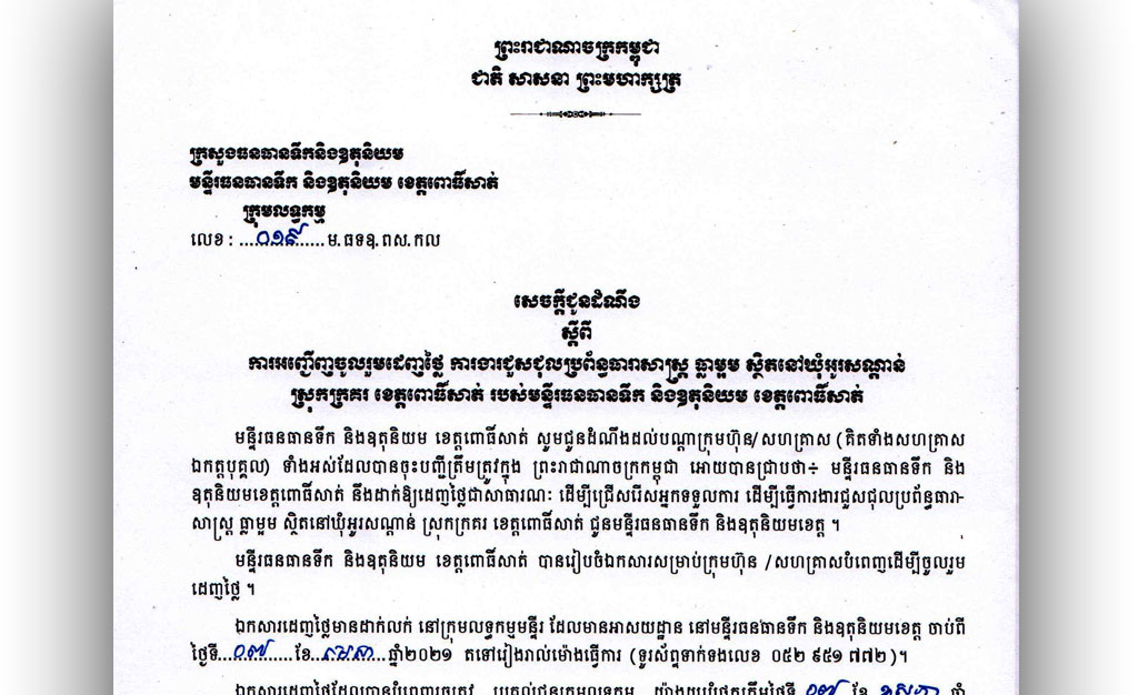 សេចក្តីជូនដំណឹង ស្តីពី ការអញ្ជើញដេញថ្លៃការងារជួសជុលប្រព័ន្ធធារាសាស្ត្រ ធ្លាម្អម ស្ថិតនៅឃុំអូរសណ្តាន់​ ​ស្រុកក្រគរ ខេត្តពោធិ៍សាត់​របស់មន្ទីរធនធានទឹក​ ​និងឧតុនិយម​ខេត្តពោធិ៍សាត់
