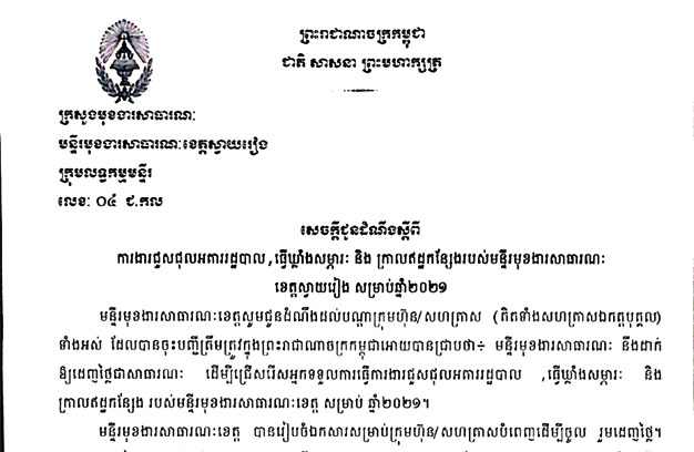 សេចក្តីជូនដំណឹងស្តីពី ការងារជួសជុលអគាររដ្ឋបាល, ធ្វើឃ្លាំងសម្ភារះ និងក្រាលឥដ្ឋកន្សែងរបស់មន្ទីរមុខងារសាធារណះខេត្តស្វាយរៀង សម្រាប់ឆ្នាំ២០២១