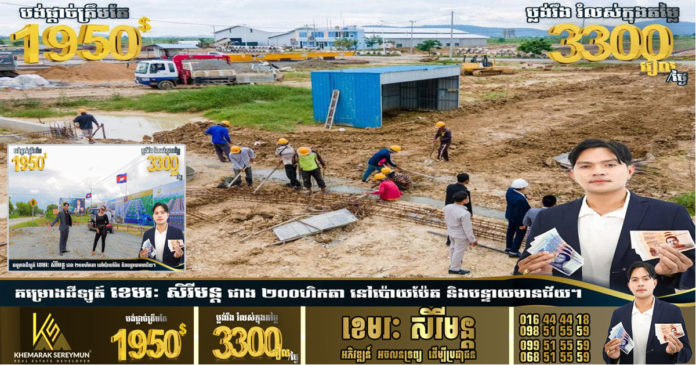 ទទឹមនិងនេះ គម្រោងដីឡូតិ៏របស់ លោកខេមរៈ សិរីមន្ត នឹងចាប់​ផ្តើម​ទទួលលុយកក់ចាប់ពីថ្ងៃទី៦ខែវិច្ឆិការឆ្នាំ២០២១នេះ​ហើយ​ដែលអតិថិជនមកមុនបានមុនព្រោះជាតម្លៃពិសេសអស្ចារ្យមិនធ្លាប់មានពីមុន។ បងប្អូនអាចទៅមើល​គម្រោងដីឡូតិ៏​ដោយ​ផ្ទាល់​ ឬ អាចទំនាក់ទំនងលេខ ទូរស័ព្ទ Cellcard 078 677 719 , 089 677 719, 095 677 719, Smart, 070 488 856 , 016 488 856 , 010 488 856, Metfone 060 677 719 , 068 677 719, 066 677 719៕