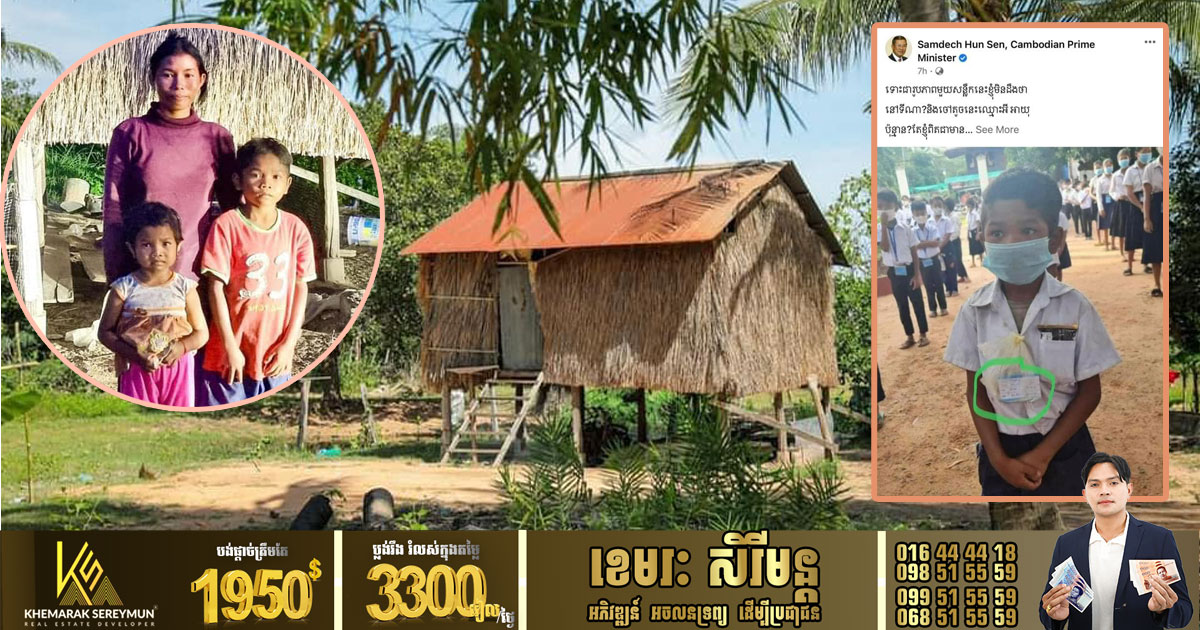 ខេត្តសៀមរាប ៖ ក្រុមគ្រួសារមួយមានជីវភាពទីទ័លក្រខ្លាំងណាស់ ដោយឪពុកម្ដាយគ្មានសូម្បីដីសម្រាប់ធ្វើស្រែ ទើបដើរប្រវាស់ដីគេធ្វើស្រែចិញ្ចឹមជីវិត តែទោះក្រខ្សត់យ៉ាងណា ក៏ខិតខំបញ្ជូនកូនចូលសាលារៀនសូត្រ ហើយសូម្បីតែស្បែកជើង ក៏គ្មានលុយទិញអោយកូនពាក់ផង ទុកឲ្យកូនប្រុសទៅរៀនទាំងគ្មានស្បែកជើង និងចងព្យួរស្បោងកាតចាក់វ៉ាក់សាំងនៅនឹងក ឈរតម្រង់ជួរចូលរៀន រហូតទទួលបានការចាប់អារម្មណ៌យ៉ាងខ្លាំងពីសម្ដេចហ៊ុន សែន នាយករដ្ឋមន្រ្ដីនាយករដ្ឋមន្ត្រីនៃព្រះរាជាណាចក្រកម្ពុជា ព្រមទាំងមហាជនជាច្រើន។