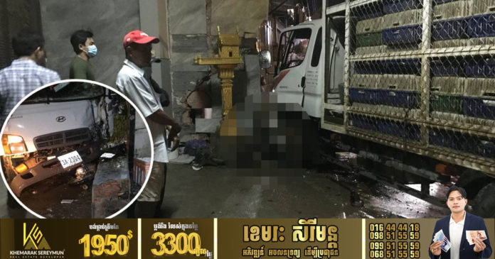 ភ្នំពេញ ៖ បុរសជាអ្នកជិះម៉ូតូម្នាក់ បានស្លាប់យ៉ាងអាណោចអាធ័ម បន្ទាប់ពីជួបគ្រោះថ្នាក់ចរាចរណ៍ ត្រូវរថយន្តដឹកមាន់ ១គ្រឿង បើកបុក រួចរុញផ្ទប់ទៅនឹងរបងផ្ទះប្រជាពលរដ្ឋ យ៉ាងពេញទំហឹង កាលពីវេលាម៉ោង ២រំលងអធ្រាត្រ ឈានចូលថ្ងៃទី០៧ ខែវិច្ឆិកា ឆ្នាំ២០២១ នៅចំណុចទល់មុខបុរី ជីប ម៉ុង លែន តាមបណ្តោយ ផ្លូវ៣៧១ ក្នុងសង្កាត់បឹងទំពន់ទី២ ខណ្ឌមានជ័យ ។