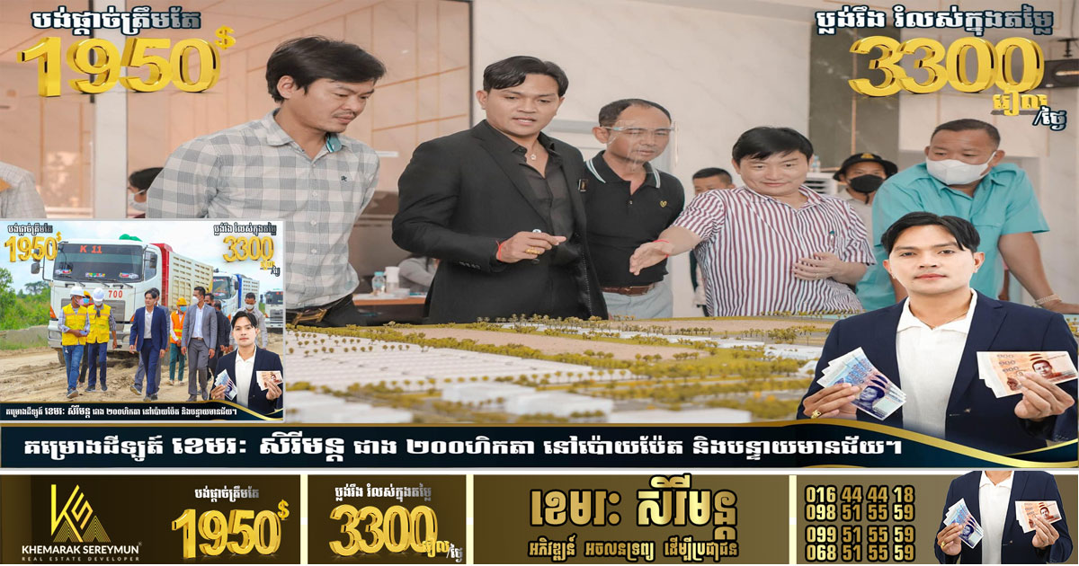 (ប៉ោយប៉ែត+បន្ទាយមានជ័យ)៖កំពូលតារាចម្រៀងខេមរៈ សិរីមន្ដ មិនត្រឹមតែជោគជ័យក្នុងអាជីពចម្រៀង នោះទេ ប៉ុន្ដែ​ការ​ចេញរកស៊ីដំបូងរបស់លោកក្នុងវិស័យអចលនទ្រព្យទ្រង់ទ្រាយធំនេះពិតជាធ្វើឲ្យមហាជនមិនសរសើរមិនបានព្រោះការលក់ដំណាក់កាលទី១របស់លោកដោយបើកទទួលលុយកក់នៅថ្ងៃទី៦ខែវិច្ឆិការ ឆ្នាំ២០២១ សោះ តែនៅថ្ងៃទី២២ខែវិច្ឆិការ ឆ្នាំ២០២១ ពោលគឺត្រឹមតែ១៦ថ្ងៃប៉ុណ្ណោះ លោកបានប្រកាសបិតតំណាក់កាលទី១ នឹងត្រៀមបើកលក់តំណាក់កាលទី២។ការលក់​ដីឡូតិ៏​ដាច់លឿនសឹងមិនគូឲ្យជឿរបែបនេះដោយសារតែអតិថិជនពេញចិត្តចំពោះទីតាំងដីនៅកន្លែងដ៏មានសក្ដានុពល ហើយ​បង់​រំលោះត្រឹម៣៣០០រៀលក្នុង១ថ្ងៃបងប្អូននឹងក្លាយទៅជាកម្មសិទ្ធដីមានប្លង់រឹងស្របច្បាប់ ម្យាងអ្វីកាន់តែពិសេសថែម​ទៀត​អតិថិជនមានទំនុកចិត្តខ្ពស់លើម្ចាស់គម្រោងគឺកំពូលតារាចម្រៀងខេមរៈ សិរីមន្ដ ដែលពួកគាត់ចាត់ទុកថាជាIdol។