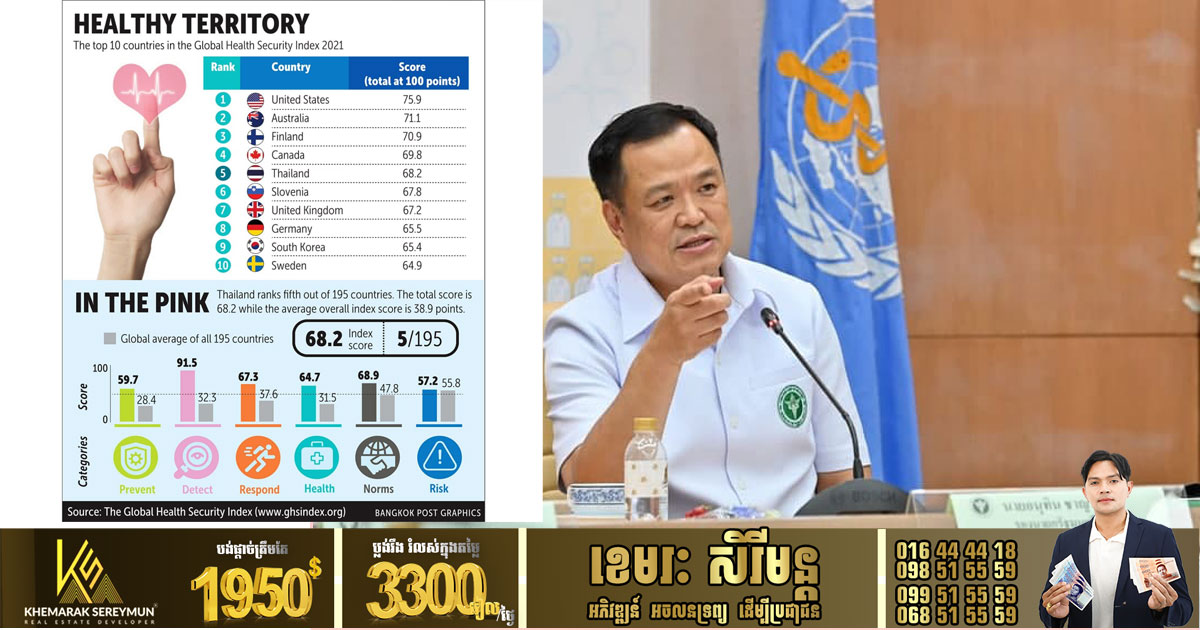 ប្រទេសថៃជាប់ចំណាត់ថ្នាក់លេខ 5 ក្នុងចំណោមប្រទេសចំនួន195នៅក្នុងសន្ទស្សន៍សុវត្ថិភាពសុខភាពសកលលោកឆ្នាំ2021ដែលបានចេញផ្សាយថ្មីៗនេះ។នេះបើតាមរដ្ឋមន្ត្រីក្រសួងសុខាភិបាលសាធារណៈលោក Anutin Charnvirakul បានប្រកាសកាលពីថ្ងៃសុក្រសប្តាហ៍មុន។ប្រទេសកំពូលទាំង10នៅក្នុងសន្ទស្សន៍សុវត្ថិភាពសុខភាពសកលឆ្នាំ 2021 គឺសហរដ្ឋអាមេរិកឈរលំដាប់លេខ១ (ពិន្ទុ75.9) អូស្ត្រាលី (71.1) ហ្វាំងឡង់ (70.9) កាណាដា (69.8) ថៃ (68.2) ស្លូវេនី (67.8) ចក្រភពអង់គ្លេស (67.2) , អាល្លឺម៉ង់ (65.5), កូរ៉េខាងត្បូង (65.4) និងស៊ុយអែត (64.9) ។សន្ទស្សន៍ដែលត្រូវបានចងក្រងដោយមជ្ឈមណ្ឌល John Hopkins សម្រាប់សន្តិសុខសុខភាពនៅសាកលវិទ្យាល័យ JohnsHopkinsនិងគំនិតផ្តួចផ្តើមការគំរាមកំហែងនុយក្លេអ៊ែរគឺផ្អែកលើសមត្ថភាពរបស់ប្រទេសនីមួយៗក្នុងការឆ្លើយតបទៅនឹងជំងឺរាតត្បាតនិងជំងឺឆ្លង។សន្ទស្សន៍នេះត្រូវបានចងក្រងជារៀងរាល់ពីរឆ្នាំម្តង។