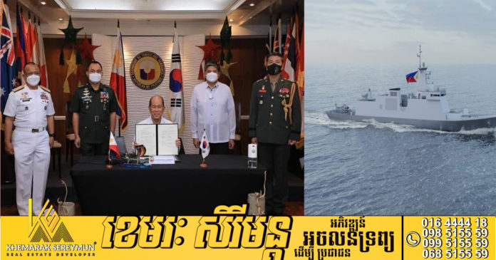 រដ្ឋមន្ត្រីការពារជាតិលោកDelfin Lorenzana បានថ្លែងកាលពីល្ងាចថ្ងៃអង្គារទី ២៨ ធ្នូ ២០២១ ថា ប្រទេសប្រទេសហ្វីលីពីន បានបញ្ជាទិញ នាវាចម្បាំងថ្មីៗចំនួន ២គ្រឿងពីក្រុមហ៊ុន Hyundai Heavy Industries របស់ប្រទេសកូរ៉េខាងត្បូងដើម្បីធ្វើ ទំនើបកម្មកងទ័ពជើងទឹកទីក្រុងម៉ានីល ស្របពេខ្លួនកំពុងប្រឈមមុខជាមួយទីក្រុងប៉េកាំង នៅតំបន់ជម្លោះសមុទ្រចិនខាង ត្បូង។នេះបើតាមការចេញផ្សាយរបស់ទីភ្នាក់ងារសារព័ត៌មាន បារាំង AFP ។ កិច្ចព្រមព្រៀងនេះមានតម្លៃ ៥៥៦លានដុល្លារ អាមេរិក ជាមួយក្រុមហ៊ុនយក្សផលិតនវាចម្បាំងកូរ៉េខាងត្បូងបានកើតមានឡើង ៥ឆ្នាំ បន្ទាប់ពីក្រុមហ៊ុននេះបានឈ្នះកិច្ច ព្រមព្រៀងសាងសង់នាវាយោធាខ្នាតតូច ចំនួនពីរគ្រឿងសម្រាប់ កងទ័ពជើងទឹកហ្វីលីពីន។ នាវាយោធាខ្នាតតូចទាំងពីរ គ្រឿងមុននេះ គឺជាប្រភេទនាវាជំនួយដែលមានល្បឿនលឿន ដែលនឹងត្រូវប្រើប្រាស់ក្នុងការការពារ នាវាចម្បាំងធំៗពីការ វាយប្រហារ។ ក្នុងសុន្ទរកថាមួយនៅឯពិធីចុះហត្ថលេខាលើកិច្ចព្រមព្រៀងខាងលើនៅទីក្រុងម៉ានីលលោក Delfin Lorenzana បានបញ្ជាក់ថា៖ «គម្រោងនេះនឹងផ្តល់ នាវាចម្បាំងទំនើបៗចំនួន ២គ្រឿង ដល់កងទ័ពជើងទឹកហ្វីលីពីន ដែលមានសមត្ថភាព ប្រឆាំងនឹងនាវាចម្បាំងផ្សេងទៀត ក៏ដូចជានាវាមុជទឹកនិងការវាយប្រហារតាមដែនអាកាសជាដើម»។