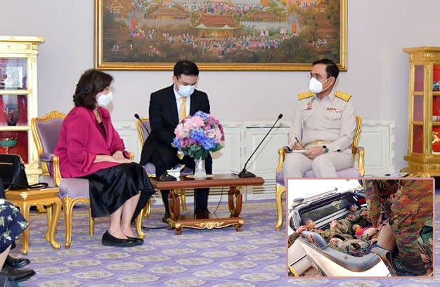 កិច្ចប្រជុំនេះធ្វើឡើងដើម្បីសម្របសម្រួល និងស្នើសុំការគាំទ្រសម្រាប់កិច្ចខិតខំប្រឹងប្រែងអន្តរជាតិ ដើម្បីជួយជនភៀស ខ្លួននិងជំរុញរបបយោធាមីយ៉ាន់ម៉ាប្តេជ្ញាចិត្តចំពោះផែនការសន្តិភាពប្រាំចំណុចរបស់អាស៊ាន។នៅក្នុងសេចក្តីថ្លែងការណ៍លោកស្រី Heyzer បាននិយាយថា នាយករដ្ឋមន្ត្រីប្រាយុទ្ធមានតួនាទីសំខាន់ក្នុងការទប់ស្កាត់ការ វិបត្តិនៅក្នុងប្រទេសមីយ៉ាន់ម៉ាដែលកំពុងមានអស្ថិរភាពនៅតាម តំបន់ព្រំដែន ។នៅក្នុងសេចក្តីថ្លែងការណ៍ដាច់ដោយឡែកមួយ លោក ប្រាយុទ្ធបាននិយាយថា បញ្ហារបស់មីយ៉ាន់ម៉ាមានភាពស្មុគ្រស្មាញ ហើយស្ថានភាពរបស់វាគួរតែត្រូវបានដោះស្រាយ បន្តិចម្តងៗដោយការយោគយល់គ្នានិងតាមរយៈការកសាងទំនុកចិត្តជា មួយមេដឹកនាំមីយ៉ាន់ម៉ា។មេដឹកនាំថៃក៏បានប្រាប់បេសកជនពិសេសរបស់អង្គការសហប្រជាជាតិថា ប្រទេសថៃមានតំបន់ មនុស្សធម៌ ហើយជនភៀសខ្លួនត្រូវបានបញ្ជូនត្រឡប់ទៅវិញតាមគោលការណ៍ស្ម័គ្រចិត្តប៉ុណ្ណោះ។ លោកបានបន្តថាប្រ ទេសថៃនឹងមិនបញ្ជូនជនភៀសខ្លួនដែលរត់គេចចេញពីអំពើហិង្សាក្នុងប្រទេសមីយ៉ាន់ម៉ាត្រឡប់ទៅវិញនោះទេ។កាលពីថ្ងៃទី១៤ ខែមករា លោកស្រី Heyzer បានជួបរដ្ឋមន្ត្រីការបរទេសថៃ លោក Don Pramudwinai ដោយបាននិយាយថា ភាគីទាំងពីរបានសម្តែងការព្រួយបារម្ភរបស់ពួកគេចំពោះអំពើហិង្សានៅក្នុងប្រទេសមីយ៉ាន់ម៉ា ហើយលោក Don បានរំលឹក ឡើងវិញនូវការត្រៀមខ្លួនរបស់ប្រទេសថៃក្នុងការសហការជាមួយអង្គការសហប្រជាជាតិក្នុងការស្វែងរកដំណោះស្រាយដោយសន្តិវិធីចំពោះស្ថានភាពនៅក្នុងប្រទេសជិតខាង។