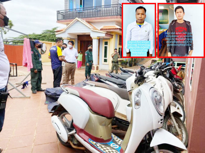 ប្រភពបន្តទៀតថា ក្នុងការចុះឆែកឆេរនោះ បានរកឃើញម៉ូតូបញ្ចាំខុសច្បាប់ ចំនួន ៩គ្រឿង រួមមាន ទី០១-ម៉ាកស្កុបពី ពណ៌ក្រហម គ្មានស្លាកលេខ។ ទី២-ម៉ាកវីវ៉ា ពណ៌ក្រហម គ្មានស្លាកលេខ។ ទី៣-ម៉ាកហុងដា ឌ្រីម សេ១២៥ ស៊េរីឆ្នាំ២០១៥ ពណ៌ខ្មៅ ពាក់ស្លាកលេខ ប៉ៃលិន 1B-0562។ ទី៤ ម៉ាក Wave RSX ពណ៌ខ្មៅ ពាក់ស្លាកលេខ ប៉ៃលិន 1C-0853។ ទី៥-ម៉ាកហុងដា ឌ្រីម សេ១២៥ ពណ៌ខ្មៅ ស៊េរីឆ្នាំ២០១៥ ពាក់ស្លាកលេខ សៀមរាប 1I-8506។ ទី៦-ម៉ាក Wave ពណ៌ខ្មៅ ពាក់ស្លាកលេខ 1C-1128។ ទី៧-ម៉ាក Wave ពណ៌ខ្មៅ ពាក់ស្លាកលេខ ភ្នំពេញ 1BG-1680។ ទី៨-ម៉ាកស្កុបពី ពណ៌ស ពាក់ស្លាកលេខ ប៉ៃលិន 1B-1447 និងទី៩-ម៉ាកស្កុបពី ពណ៌ស ពាក់ស្លាកលេខ បាត់ដំបង 1AH-5332។