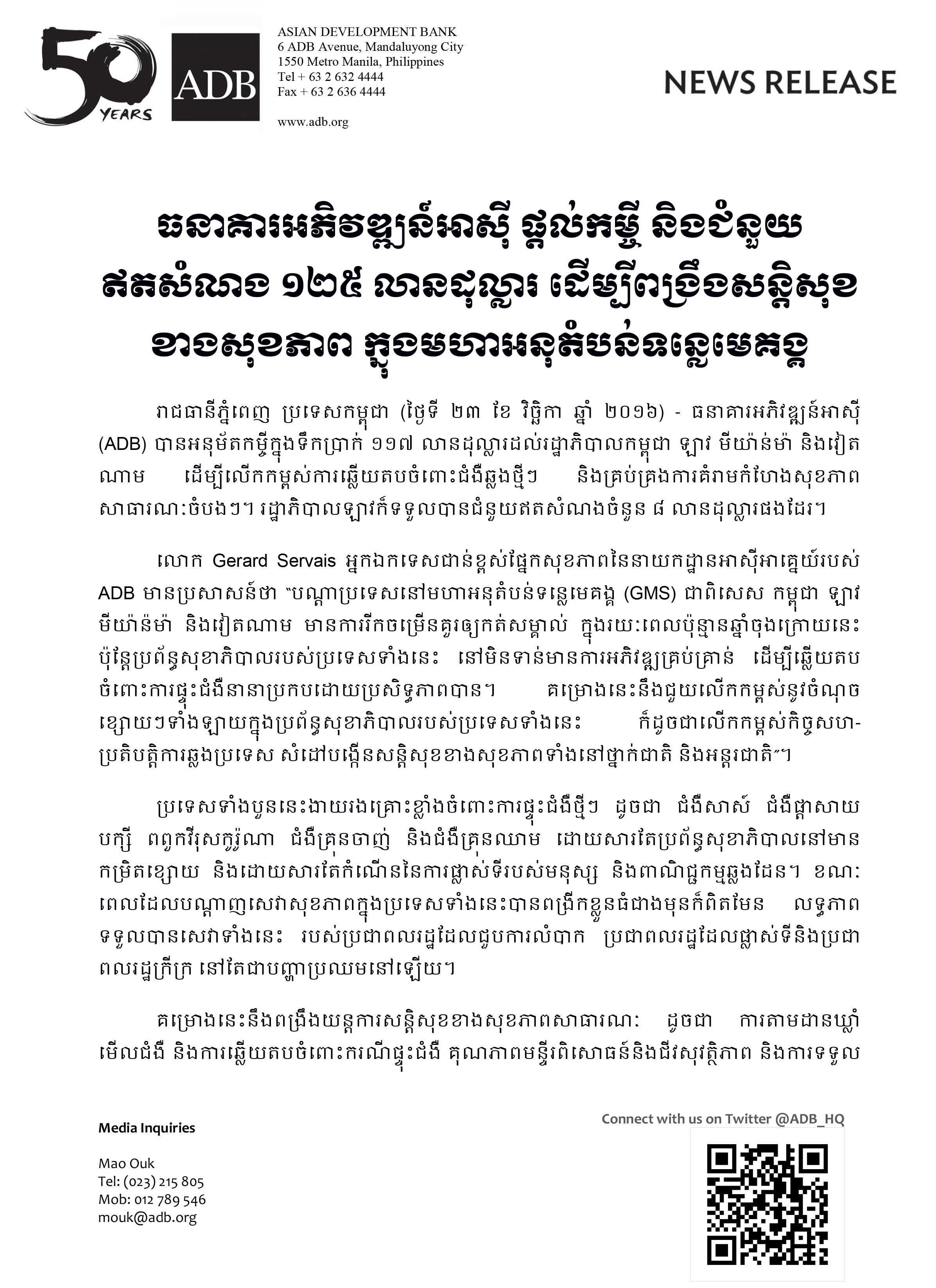 ADB ផ្ដល់កម្ចី និងជំនួយឥតសំណង ១២៥លានដុល្លារ ពង្រឹងសន្តិសុខ ខាងសុខភាព ក្នុងមហាអនុតំបន់ទន្លេមេគង្គ