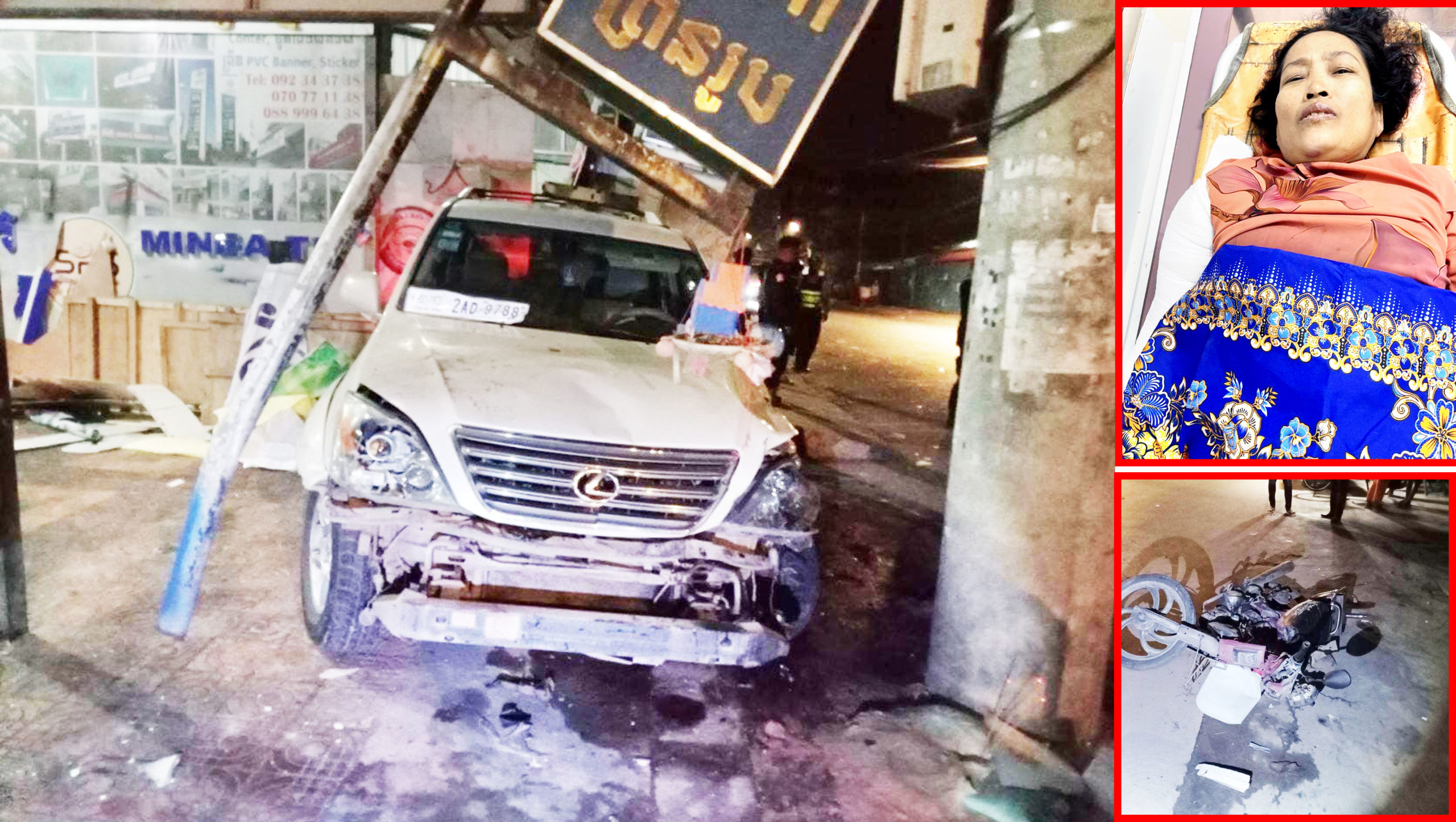 របួសធ្ងន់ និងត្រូវបានដឹកបញ្ជូនទៅកាន់មន្ទីរពេទ្យ ដើម្បីសង្គ្រោះភ្លាមៗ។ រីឯរថយន្ត បន្តទៅបុកបង្គោល ១ដើម ទើបទៅមុខលែងរួចតែម្តង។