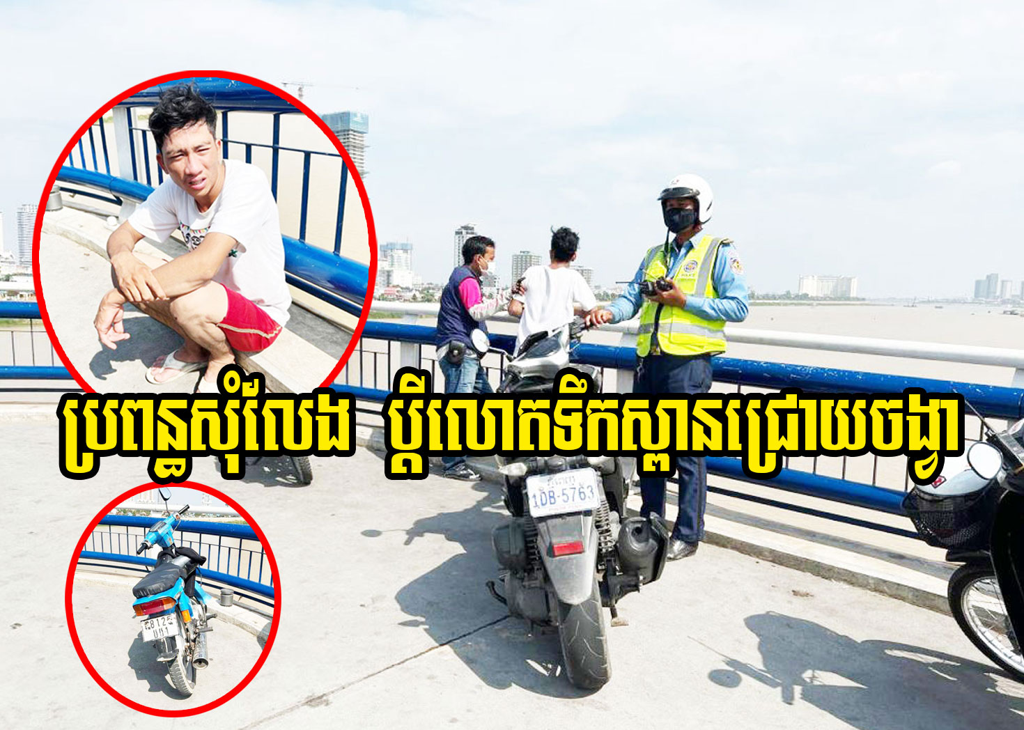 តាមព័ត៌មានពីកន្លែងកើតហេតុ បានឱ្យដឹងថា មុនពេលកើតហេតុ គេឃើញបុរសរូបនោះ បានជិះម៉ូតូម៉ាកហុងដា ធុនសេ ១០០កូរ៉េ ពណ៌ទឹកប៊ិក ធ្វើដំណើរឡើងស្ពានក្នុងទិសដៅពីលិច ទៅកើត។ នៅពេលធ្វើដំណើរជិតដល់កណ្តាលស្ពាន បុរសរូបនោះ ក៏បានឈប់ម៉ូតូ ដើរទៅតោងបង្កាន់ដៃស្ពាន ប្រុងលោតទឹកសម្លាប់ខ្លួន តែហាក់ដូចជាពុំដាច់ចិត្ត ភ្លាមៗនោះ ប្រជាពលរដ្ឋធ្វើដំណើរ ក៏បានឃាត់សួរនាំ និងរាយការណ៍ទៅនគរបាលចរាចរណ៍ ប្រចាំគោលដៅរង្វង់មូលកួចកាណុង នាំទៅសាកសួរ។