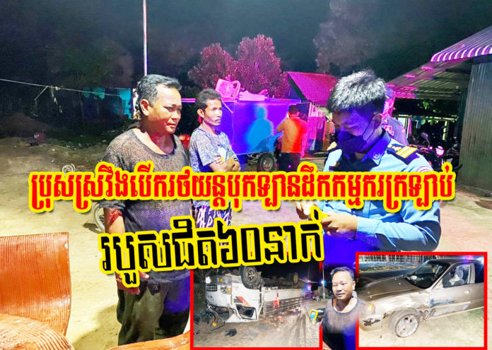 ១គ្រឿង ម៉ាកហុងដា ស៊ីវីក (Honda Civic) ពណ៌ស គ្មានស្លាកលេខ បើកបរដោយឈ្មោះរិន អាយុ៥០ឆ្នាំ រស់នៅភូមិត្រពាំងថ្ម ឃុំស្វាយ ស្រុកសាមគ្គីមានជ័យ បើកបរក្នុងស្ថានភាពស្រវឹង បណ្តាលឱ្យរថយន្តដឹកកម្មករ ក្រឡាប់ផ្ងារជើងឡើងលើ បណ្តាលឱ្យកម្មករ ចំនួន៥៧នាក់ បានរងរបួស ក្នុងនោះ ៨នាក់ រងរបួសធ្ងន់ អ្នករងរបួសទាំងអស់ ត្រូវ