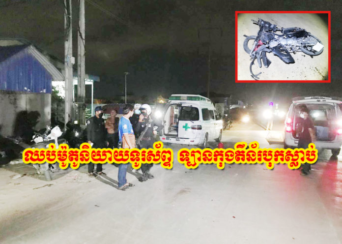 ភ្នំពេញ ៖ បុរសកំពុងជិះម៉ូតូតាមផ្លូវសុខៗ ក៏មានគេទូរស័ព្ទមក ទើបអែបម៉ូតូឈប់លើចិញ្ចើមផ្លូវ ដើម្បីលើកទូរស័ព្ទ ស្រាប់តែរំពេចនោះ មានរថយន្តកុងតឺន័រ ១គ្រឿង បើកក្នុងល្បឿនលឿនដូចហោះ បោះពួយមកបុកពីក្រោយយ៉ាងពេញទំហឹង បណ្តាលឱ្យស្លាប់យ៉ាងអាណោចអាធ័ម ចំណែករថយន្តបង្កហេតុ បានបើកចូលការ៉ាស់បាត់ធ្វើព្រងើយ។