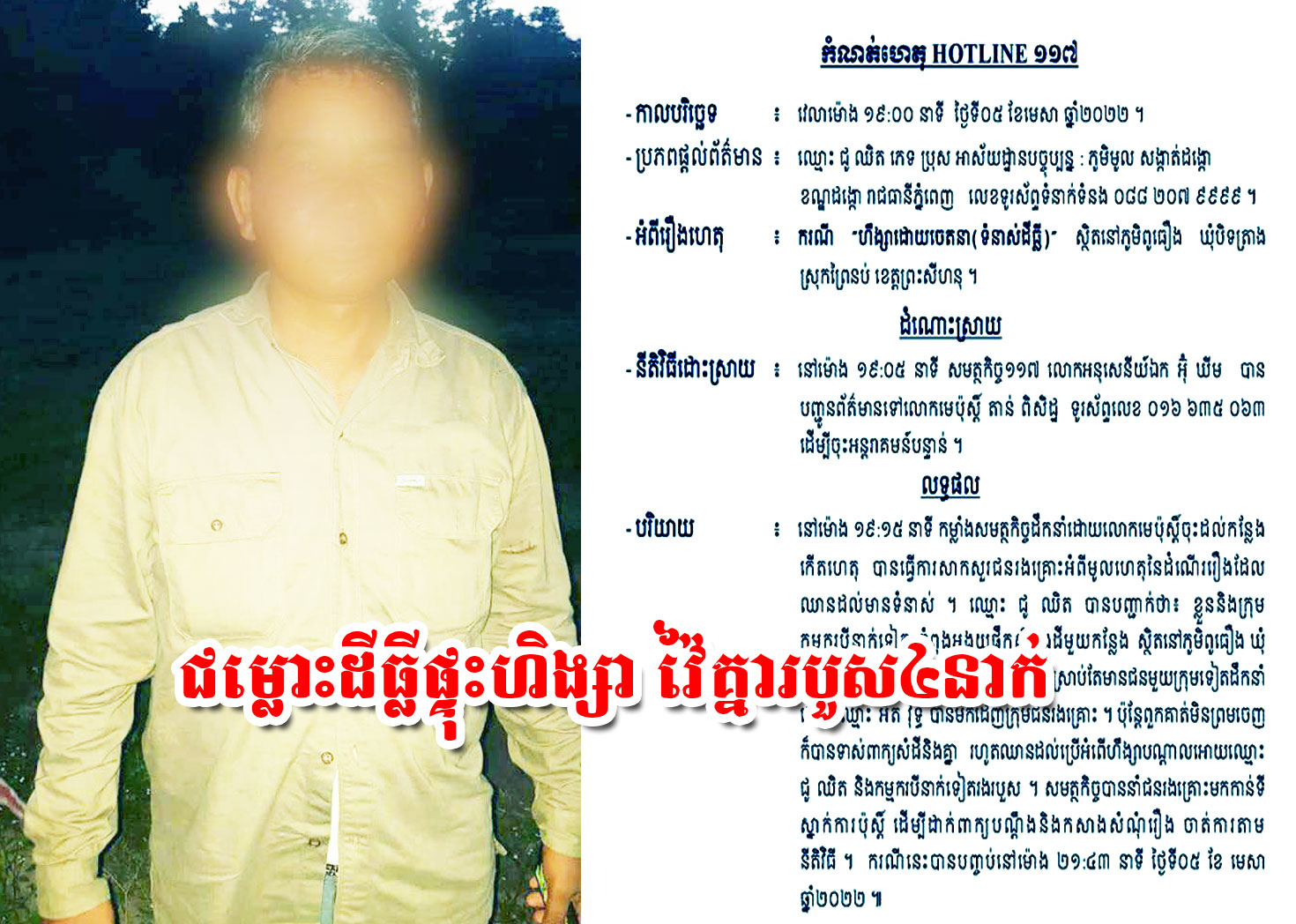 យោងតាមកំណត់ហេតុរបស់ក្រុមការងារមជ្ឈមណ្ឌលប្រចាំបញ្ជា នៃអគ្គស្នងការដ្ឋាននគរបាលជាតិ បានបញ្ជាក់ឱ្យដឹងថា កាលពីវេលាម៉ោង ៧យប់ ថ្ងៃទី០៥ ខែមេសា ឆ្នាំ២០២២ ឈ្មោះជូ ឈិត ភេទប្រុស មានលំនៅភូមិម័ល សង្កាត់ដង្កោ ខណ្ឌដង្កោ រាជធានីភ្នំពេញ បានរាយការណ៍ពីករណីហិង្សាដោយចេតនា (ទំនាស់ដីធ្លី) ស្ថិតនៅភូមិពូធឿង ឃុំបិទត្រាំង ស្រុកព្រៃនប់ ខេត្តព្រះសីហនុ។