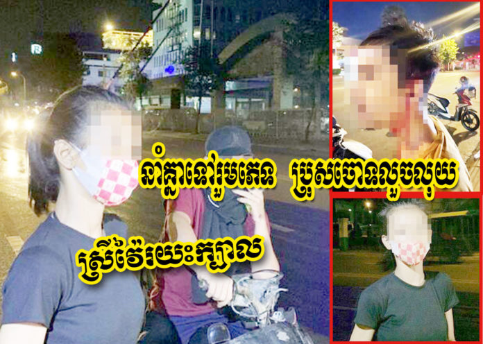 បុរសរងគ្រោះ បន្តថា ប៉ុន្តែនៅតាមផ្លូវ នារីខាងលើ បានបន្លំលួចលុយគាត់អស់ចំនួន ២០ម៉ឺនរៀល និងទារចុះពីលើកង់បី មិនព្រមទៅជាមួយគាត់ទេ ធ្វើឱ្យមានការប្រកែកគ្នា ហើយនារីរូបនោះ ក៏បានហៅបក្ខពួករបស់នាងមកវាយរូបគាត់ បណ្តាលឱ្យបែកក្បាល ហូរឈាមស្រោចខ្លួនតែម្តង ដោយចោទប្រកាន់ថា លួចទូរស័ព្ទនាងទៅវិញ។