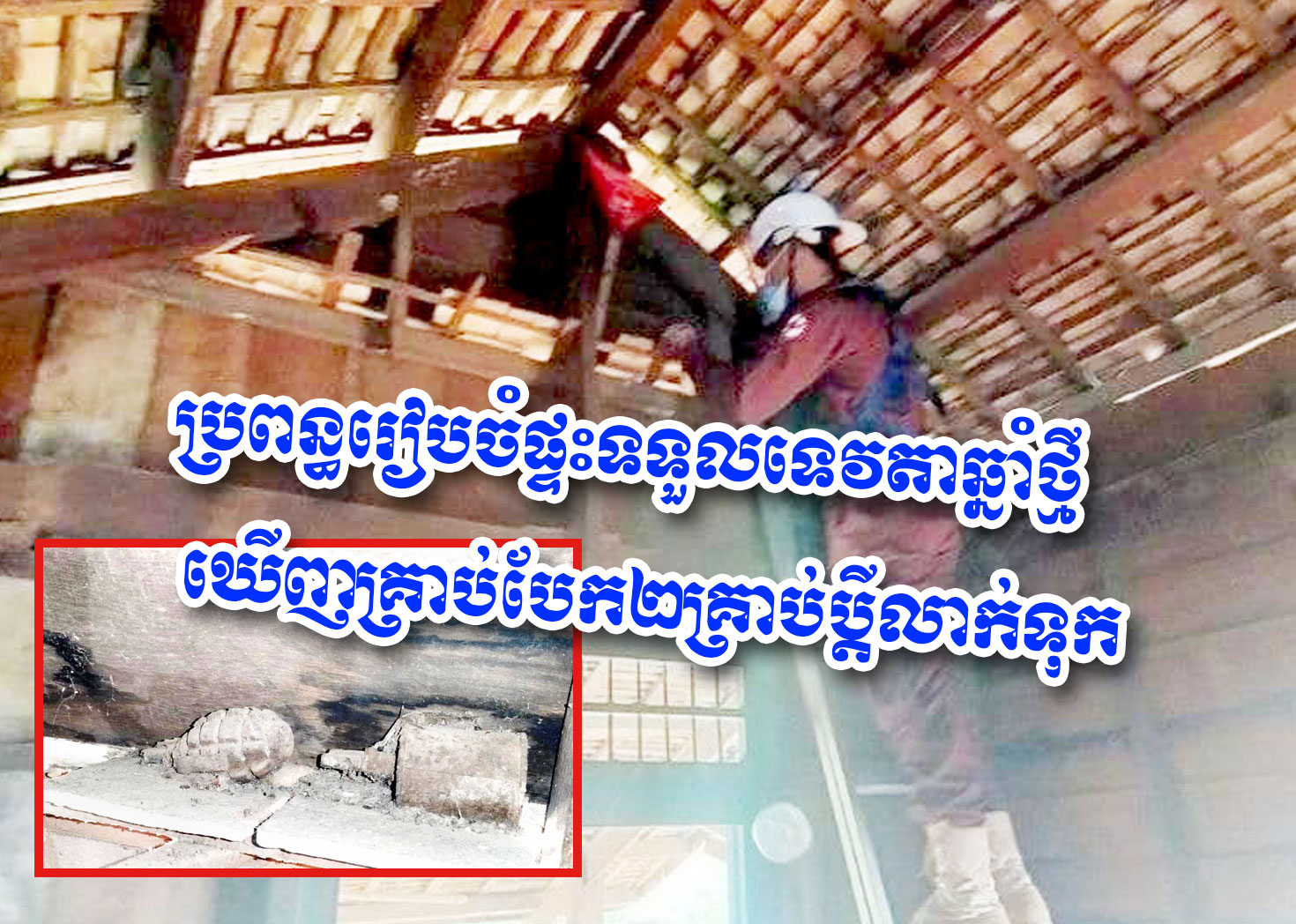 ខេត្តសៀមរាប ៖ ស្ត្រីវ័យចំណាស់ម្នាក់ បានរៀបចំបោសសម្អាតផ្ទះ ដើម្បីរង់ចាំទទួលទេវតាឆ្នាំថ្មី ស្រាប់តែពេលឡើងបោសនៅលើដំបូល បែរជាប្រទះឃើញគ្រាប់បែកដៃ ចំនួន២គ្រាប់ នៅលើធ្នើរក្រោមដំបូលផ្ទះរបស់ខ្លួន ដែលប្តីរបស់ខ្លួនបានលាក់ទុក បង្កឱ្យមានការភ័យឆោឡោ រាយការណ៍ទៅខាងជំនាញស៊ីម៉ាក់ ចុះមកជួយអន្តរាគមន៍ភ្លាមៗ។