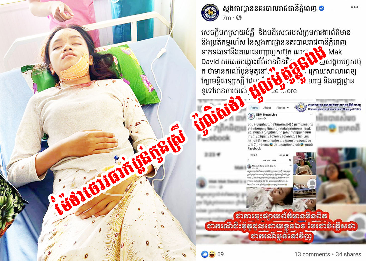 បន្ទាប់ពីបានឃើញគណនីហ្វេសប៊ុកខាងលើ ចុះផ្សាយ ក្រុមការងារព័ត៌មាននិងប្រតិកម្មរហ័សនៃស្នងការដ្ឋាននគរបាលរាជធានីភ្នំពេញ សូមធ្វើការបដិសេធថា មិនមែនជាករណីប្លន់នោះទេ ជាក់ស្តែងជាករណីជិះម៉ូតូដួលដោយខ្លួនឯង។