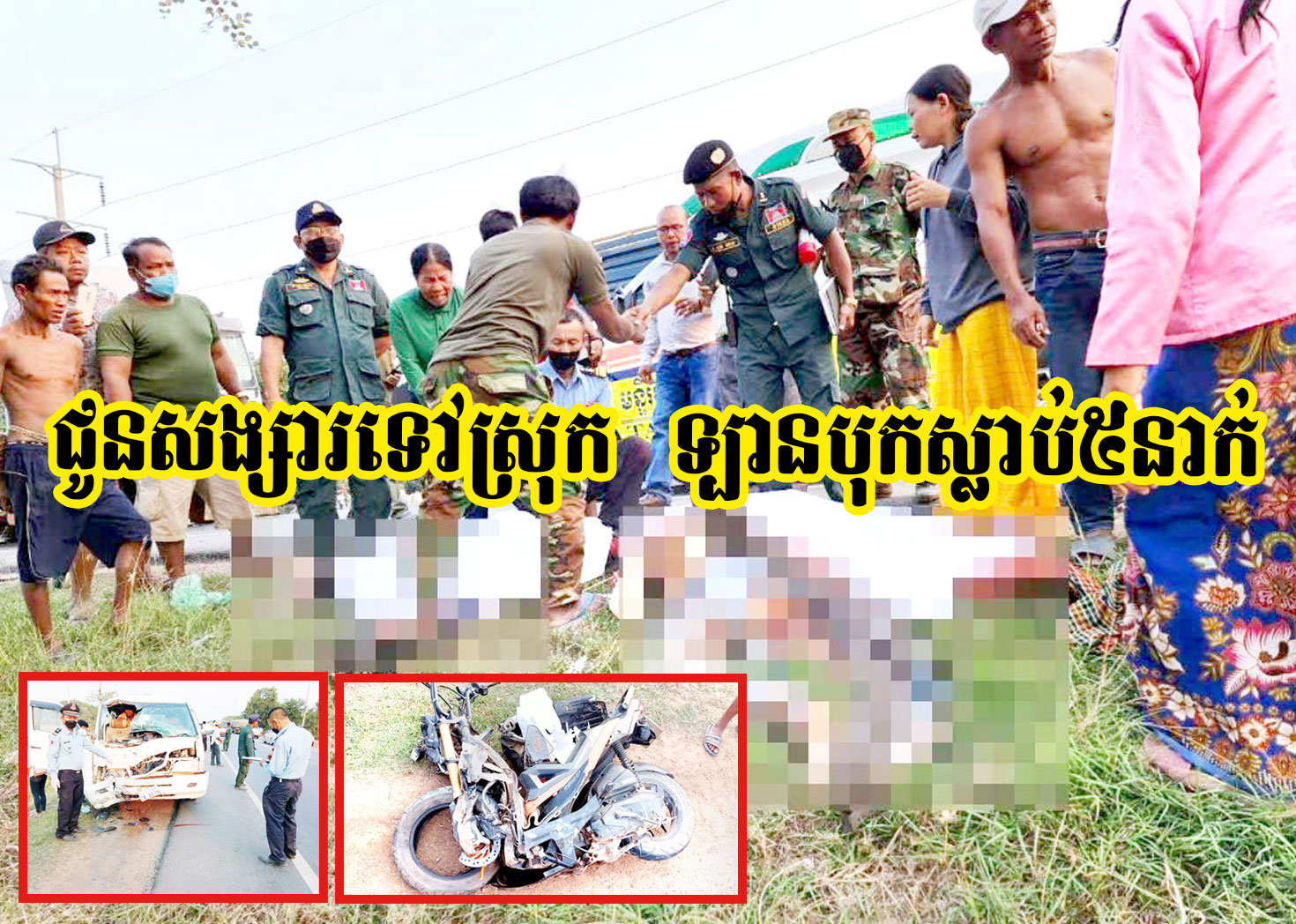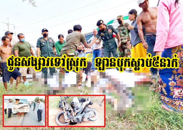 ខេត្តសៀមរាប ៖ យុវជនម្នាក់ ជិះម៉ូតូដឹកមិត្តស្រីរបស់ខ្លួនចំនួន២នាក់ សំដៅទៅស្រុកកំណើត ស្រាប់តែអកុសល ដោយសារការជិះវ៉ាជែងក្នុងស្ថានភាពគ្រោះថ្នាក់ ដោយមិនប្រុងប្រយ័ត្ន ក៏ធ្វើឱ្យជ្រុលទៅបុករថយន្តសាំងយ៉ុងដឹកអ្នកដំណើរ ១គ្រឿង បណ្តាលឱ្យភាគីម៉ូតូស្លាប់ទាំង ៣នាក់ រីឯភាគីរថយន្ត បានបាត់បង់ជីវិតអ្នកដំណើរចំនួន២នាក់ ខណៈដែលតៃកុងរថយន្ត បានចុះរត់គេចខ្លួនបាត់ស្រមោលភ្លាមៗ។