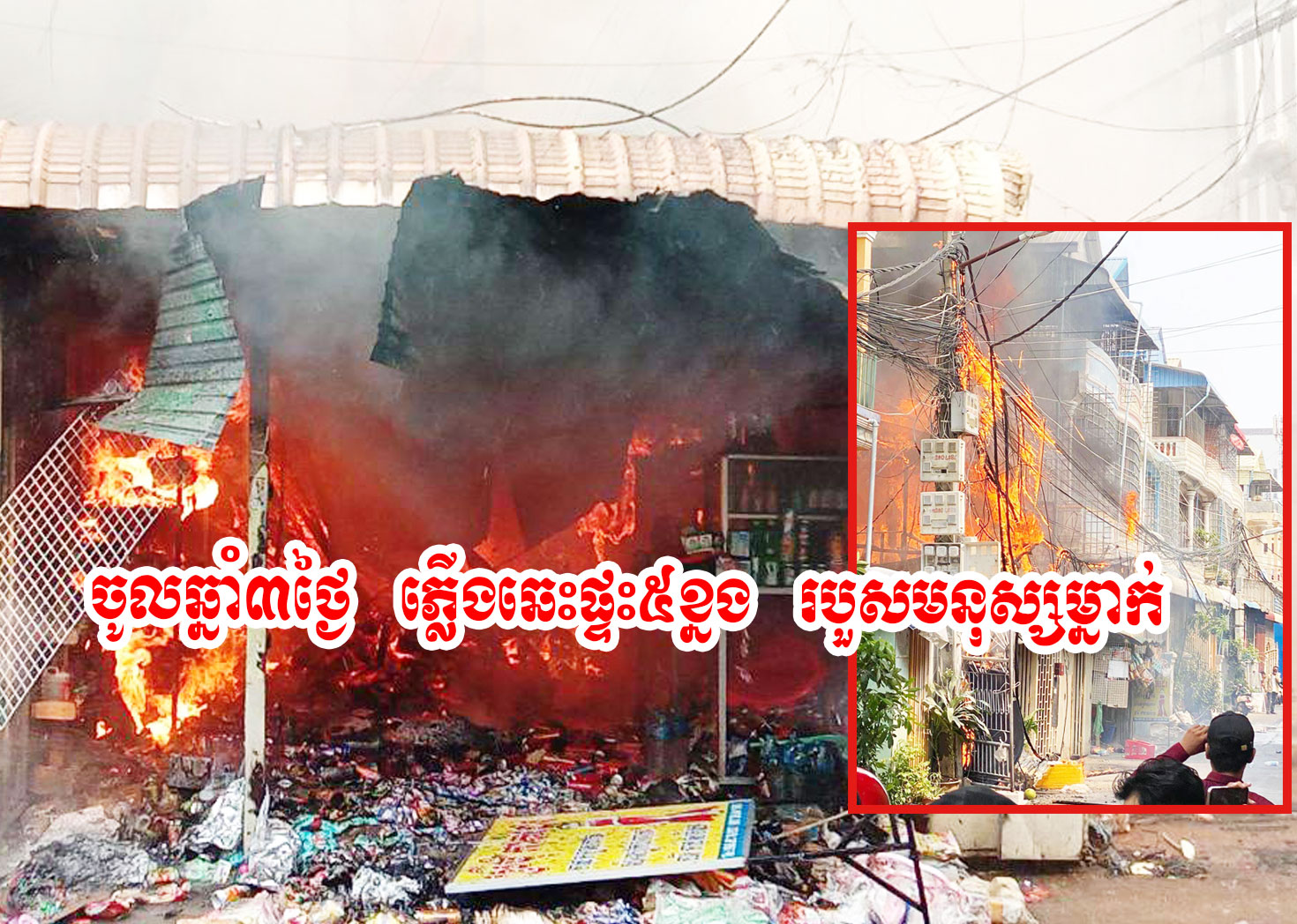 ផ្ទះអស់ចំនួន ២ខ្នង។ ករណីទី៥- ខេត្តសៀមរាប អគ្គិភ័យបានកើតឡើងចំនួន ១លើក មូលហេតុភ្លើងសំរាម បណ្តាលឱ្យឆេះខ្សែភ្លើងអស់ចំនួន ៣៧ដុំ និងករណីទី៦-ខេត្តត្បូងឃ្មុំ អគ្គិភ័យបានកើតឡើងចំនួន ១លើក មូលហេតុ កំពុងស្រាវជ្រាវ បណ្តាលឱ្យឆេះផ្ទះអស់ ចំនួន ១ខ្នង។