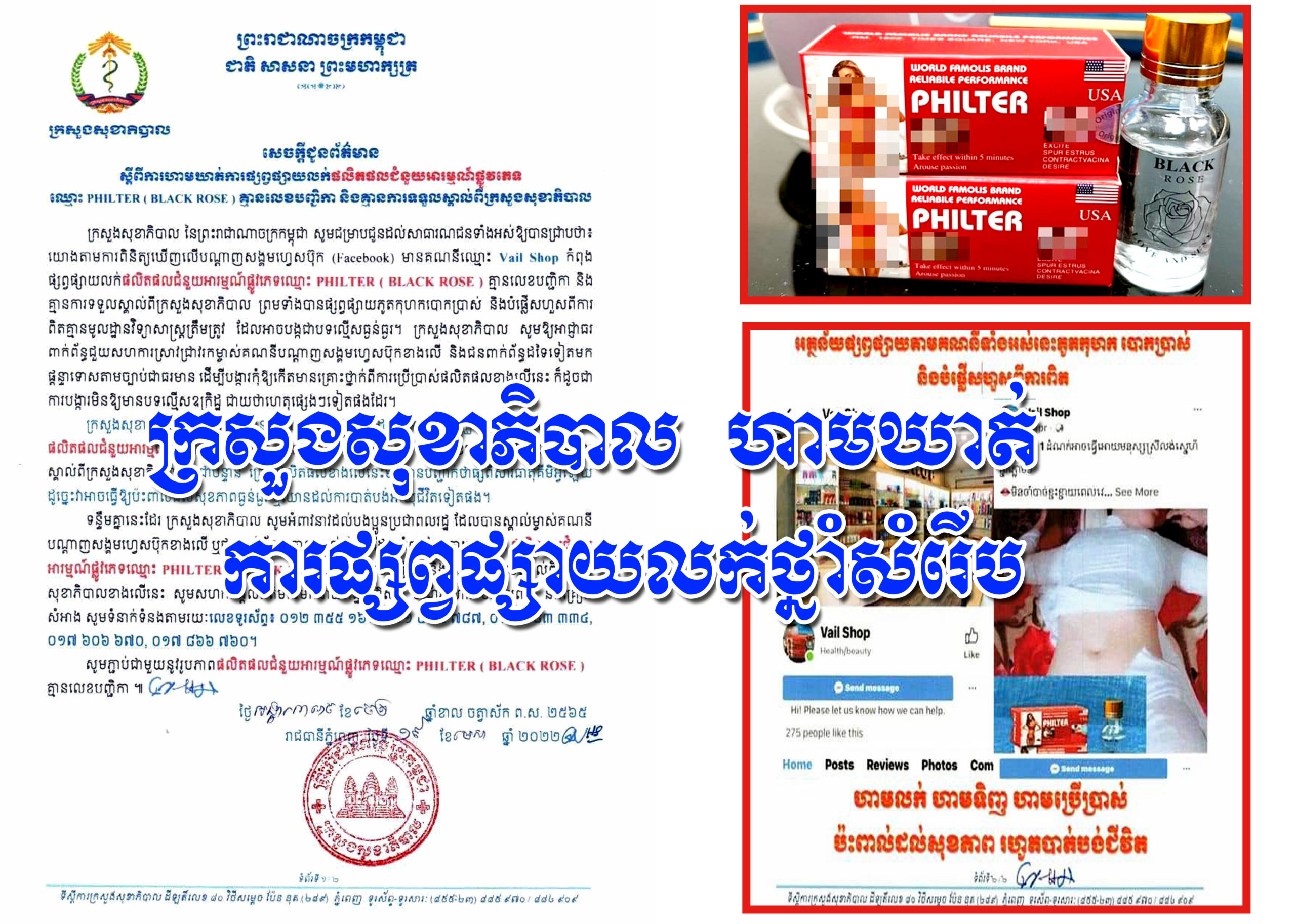ក្រសួងសុខាភិបាល សូមជូនព័ត៌មានដល់បងប្អូនប្រជាពលរដ្ឋទាំងអស់ ត្រូវបញ្ឈប់ការទិញ និងប្រើប្រាស់ផលិតផលជំនួយអារម្មណ៍ផ្លូវភេទ ឈ្មោះ PHILTER (BLACK ROSE) គ្មានលេខបញ្ជិកា និងគ្មានការទទួលស្គាល់ពីក្រសួងសុខាភិបាល នេះជាបន្ទាន់ ព្រោះផលិតផលខាងលើនេះ មិនបានបញ្ជាក់ថាផ្សំពីសារធាតុគីមីអ្វីឡើយ ដូច្នេះវាអាចធ្វើឱ្យប៉ះពាល់ដល់សុខភាពធ្ងន់ធ្ងរ ឬឈានដល់ការបាត់បង់អាយុជីវិតទៀតផង។