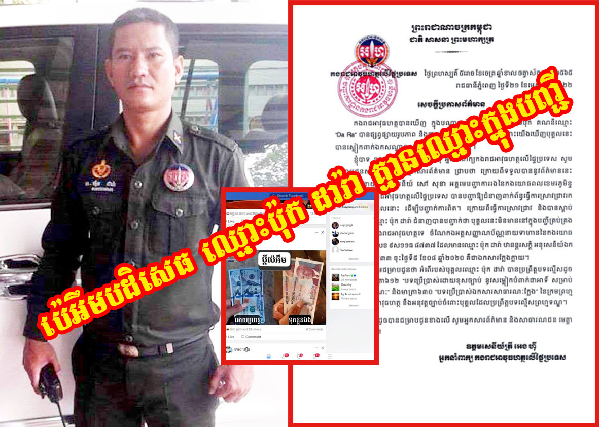 ខ្ញុំបាទសូមជម្រាបជូនថា អំពើរបស់បុគ្គលឈ្មោះប៉ុក ដារ៉ា បានប្រព្រឹត្តបទល្មើស ដូចមានចែងក្នុងមាត្រា៦១២ “បទប្រើប្រាស់ដោយខុសច្បាប់នូវសម្លៀកបំពាក់ជាអាទិ៍ សម្រាប់អាជ្ញាធរសាធារណៈ” និងមាត្រា៦៣០ “បទប្រើប្រាស់ឯកសារសាធារណៈក្លែង” នៃក្រមព្រហ្មទណ្ឌ។ កងរាជអាវុធហត្ថ នឹងអនុវត្តច្បាប់ចំពោះបុគ្គលដែលប្រព្រឹត្តបទល្មើសព្រហ្មទណ្ឌ…»៕