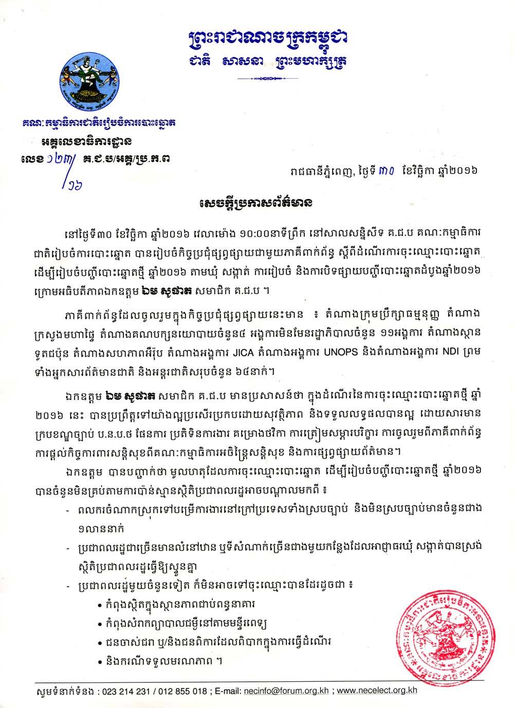 សូមអានខ្លឹមសារទាំងស្រុង នៃសេចក្ដីប្រកាសព័ត៌មាន របស់អគ្គលេខាធិការដ្ឋានគណៈកម្មាជាតិរៀបចំការបោះឆ្នោត ចុះថ្ងៃទី៣០ ខែវិច្ឆិកា ឆ្នាំ២០១៦ ៖