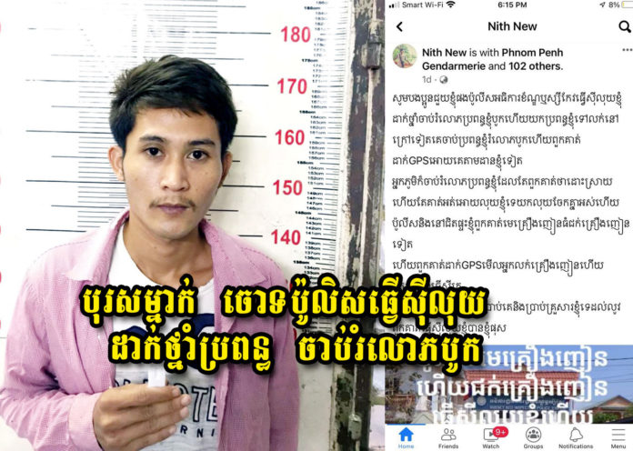 រូបអធិការដ្ឋាននគរបាលខណ្ឌឫស្សីកែវ ផុសដោយសរសេរអក្សរពីលើថា “ប៉ូលិសមេគ្រឿងញៀន ហើយជក់គ្រឿងញៀន ធ្វើស៊ីលុយខ្ញុំហើយ ដាក់ GPS ឱ្យអ្នកភូមិមើលខ្ញុំទៀត”។