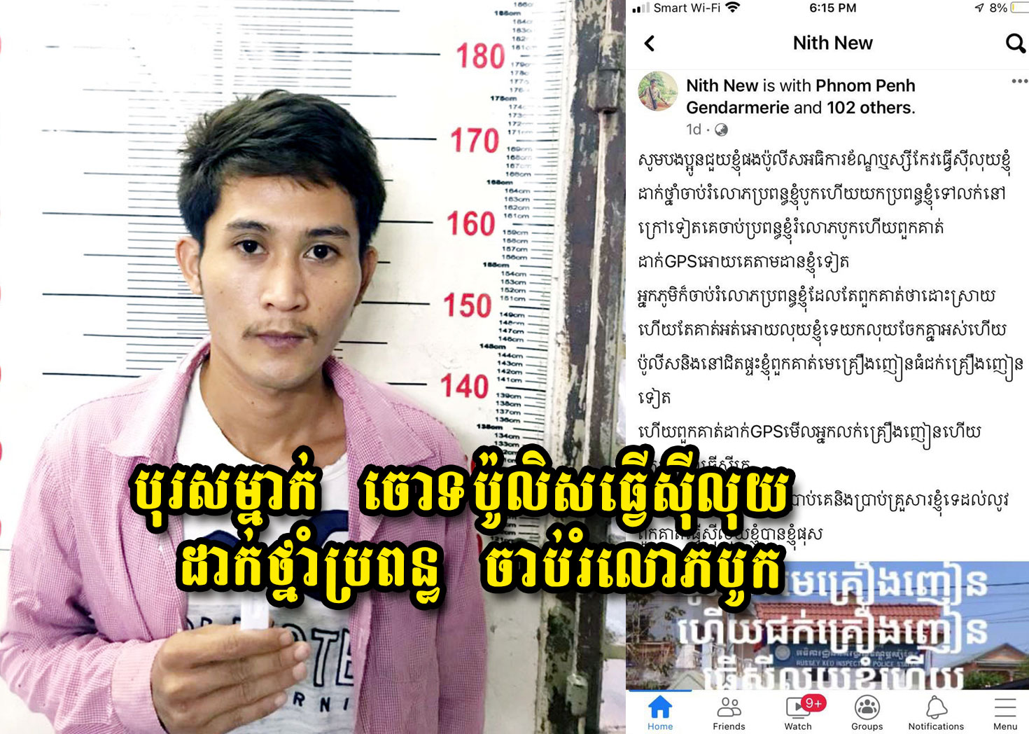 ភ្នំពេញ ៖ បុរសម្នាក់ បានបែកគំនិតយករូបភាពអធិការដ្ឋាននគរបាលខណ្ឌឫស្សីកែវ មកបង្ហោះ រួចចោទប្រកាន់ថា ប៉ូលិសខណ្ឌឫស្សីកែវ ធ្វើស៊ីលុយខ្លួនហើយ ថែមទាំងបានដាក់ថ្នាំរំលោភបូកប្រពន្ធខ្លួនទៀតផង ជាហេតុធ្វើឱ្យកើតមានការភ្ញាក់ផ្អើលពេញបណ្តាញសង្គមហ្វេសប៊ុក និងត្រូវបានសមត្ថកិច្ចខណ្ឌឫស្សីកែវ ឃាត់ខ្លួន នាំយកទៅសាកសួរ។