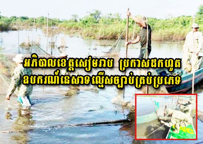 ខេត្តសៀមរាប ៖ លោកទៀ សីហា អភិបាលនៃគណៈអភិបាលខេត្តសៀមរាប បានប្រកាសដកហូតឧបករណ៍នេសាទល្មើសច្បាប់គ្រប់ប្រភេទ ក្នុងភូមិសាស្ត្រខេត្តសៀមរាប។