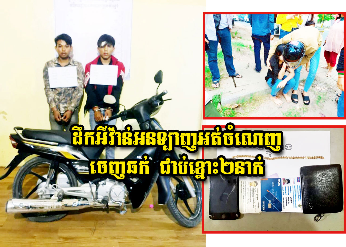 មកពីក្រោយ ដល់ទន្ទឹម បានធ្វើសកម្មភាពឆក់យក ទូរស័ព្ទរបស់ជនរងគ្រោះដែលទុកនៅក្នុងហោប៉ៅម៉ូតូខាងមុខ រួចជិះគេចខ្លួន។ ភ្លាមនោះជនរងគ្រោះបានស្រែកថា ចោរ!ៗ ហើយបានជិះម៉ូតូដេញតាមពីក្រោយ រហូតដល់រោងចក្រដើមត្នោត ក៏បានបុកម៉ូតូជនសង្ស័យពីក្រោយ បណ្តាលឲ្យដួល រងរបួសទាំងអស់គ្នា ក៏ត្រូវបានប្រជាពលរដ្ឋ និងសមត្ថកិច្ចជួយអន្តរាគមន៍ឃាត់ជនសង្ស័យបានជាបន្តបន្ទាប់ រួចបញ្ជូនមកកាន់អធិការដ្ឋាននគរបាលក្រុងតាខ្មៅ ដើម្បីធ្វើការសាកសួរ និងកសាងសំណុំរឿងតាមនីតិវិធី៕