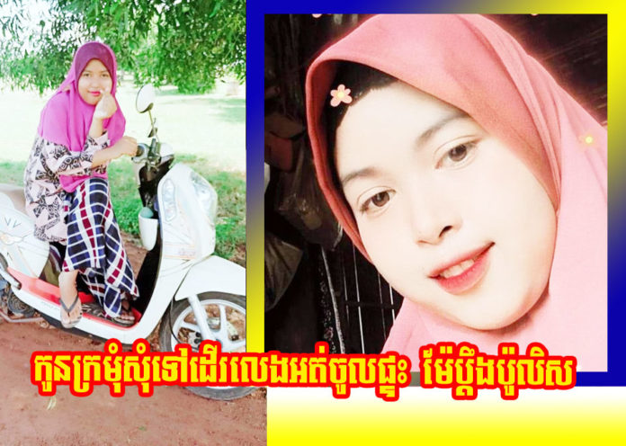 ខេត្តត្បូងឃ្មុំ ៖ ក្រមុំខ្មែរ-អ៊ិស្លាម រូបស្រស់ម្នាក់ បានសុំម្តាយទៅដើរលេងជាមួយមិត្តភក្តិ រួចក៏ជិះម៉ូតូចេញពីផ្ទះបាត់ ស្រាប់តែមិនឃើញវិលត្រឡប់មកផ្ទះវិញសោះ ធ្វើឱ្យក្រុមគ្រួសារមានការភ័យព្រួយ ចែកផ្លូវគ្នាតាមរកអស់រយៈពេល ២ថ្ងៃមកហើយ នៅតែមិនឃើញ ទើបរាយ ការណ៍ប្រាប់សមត្ថកិច្ចឱ្យជួយអន្តរាគមន៍។