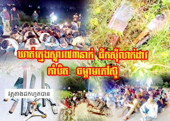ភ្នំពេញ ៖ ក្រុមក្មេងទំនើងប្រុសស្រីសរុបចំនួន ៧៣នាក់ ក្នុងនោះមានស្រី២នាក់ កំពុងប្រមូលផ្តុំគ្នាផឹកស៊ីក្អាកក្អាយ ក៏ត្រូវបានកម្លាំងចម្រុះនៃអធិការដ្ឋាននគបាលខណ្ឌសែនសុខ ចុះឃាត់ខ្លួនភ្លាមៗ ព្រមទាំងដកហូតម៉ូតូ ជាច្រើនគ្រឿង បន្ទាប់ពីរកឃើញវត្ថុតាង ដាវ កាំបិត ជាច្រើនដើម ដែលពួកគាត់លាក់នៅតាមគុម្ពោត ព្រៃក្បែរវង់ផឹកស៊ី។