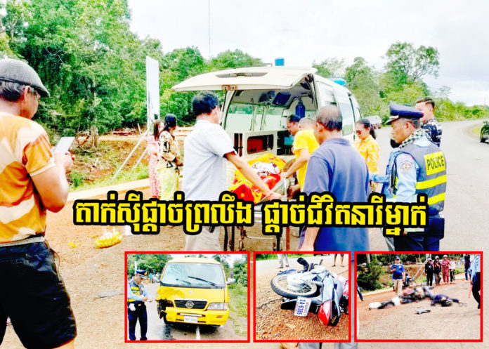 ខេត្តមណ្ឌលគិរី ៖ រថយន្តតាក់ស៊ីផ្តាច់ព្រលឹង មួយគ្រឿង បើកបរក្នុងល្បឿនយ៉ាងលឿន រួចក៏ជ្រុលទៅបុកម៉ូតូ ១គ្រឿង យ៉ាងពេញទំហឹង បណ្តាលឱ្យនារីជាអ្នកបើកម៉ូតូ បានស្លាប់នៅនឹងកន្លែងយ៉ាងអាណោចអាធ័ម ចំណែកតៃកុងរថយន្តបង្កហេតុ បានចុះរត់គេចខ្លួនបាត់។