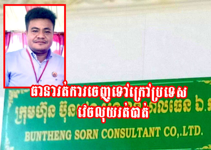 ភ្នំពេញ ៖ លោកសន ប៊ុនថេង ដែលជាប្រធានក្រុមហ៊ុន ប៊ុនថេង សន ខនសាល់ធេន ឯ.ក ត្រូវបានប្រជាពលរដ្ឋចោទប្រកាន់ថា បានបោកប្រាស់លុយពីប្រជាពលរដ្ឋជាច្រើនរូប ដោយអះអាងថា ជួយរត់ការឱ្យចេញទៅធ្វើការនៅក្រៅប្រទេស ដោយក្នុងម្នាក់ចំណាយអស់រាប់ ពាន់ដុល្លារ ស្រាប់តែចុងក្រោយ វេចលុយរត់បាត់។