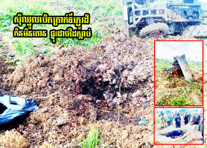 ខេត្តព្រះវិហារ ៖ បុរសម្នាក់ បានទៅស៊ីឈ្នួលភ្ជួរដីចម្ការឱ្យគេ លុះពេលកំពុងបើកត្រាក់ទ័រភ្ជួរដីសុខៗ ស្រាប់តែកិនចំមីនតោន ១គ្រាប់ ដែលសេសសល់តាំងពីសម័យសង្គ្រាម បណ្តាលឱ្យផ្ទុះកក្រើក ធ្វើឱ្យរងរបួសដាច់ដៃម្ខាង ស្លាប់នៅនឹងកន្លែងយ៉ាងអាណោចអាធ័ម ចំណែកត្រាក់ទ័រ រងការខូចខាតទាំងស្រុង។