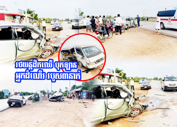 ខេត្តបន្ទាយមានជ័យ ៖ រថយន្តសាំងយ៉ុង ដឹកឈើ ១គ្រឿង បើកបរក្នុងល្បឿនយ៉ាងលឿន ស្រាប់តែអ្នកបើកបរងងុយដេក ងោកមួយភាំង ក៏ធ្វើឱ្យរេចង្កូតជ្រុលទៅបុករថយន្តព្រូស មួយគ្រឿង យ៉ាងពេញទំហឹង បណ្តាលឱ្យរងការខូចខាតទាំងសងខាង និងបង្កឱ្យមនុស្សចំនួន ៣នាក់ ទទួលរងរបួសធ្ងន់-ស្រាល។