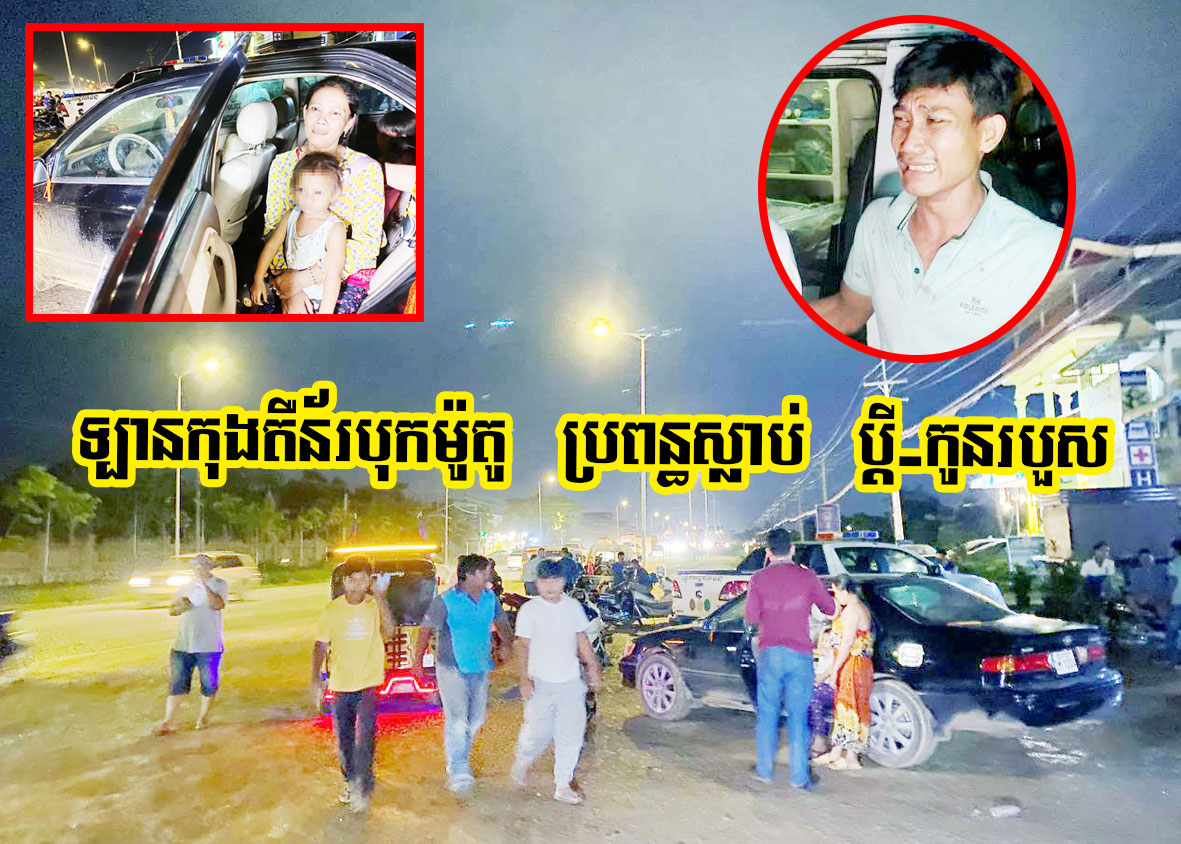ភ្នំពេញ ៖ ក្រុមគ្រួសារមួយ មានគ្នា៣នាក់ (ប្តីប្រពន្ធ និងកូនតូច) ជិះម៉ូតូដឹកគ្នាតាមផ្លូវសុខៗ ក៏បត់ឆ្វេងឆ្លងផ្លូវ ស្រាប់តែត្រូវរថយន្តកុងតឺន័រ ១គ្រឿង បើកក្នុងល្បឿនលឿន បានជ្រុលមកបុក បណ្តាលឱ្យដួលម៉ូតូ បោកទៅនឹងថ្នល់ ខ្ទាតស្ត្រីជាប្រពន្ធចូលក្រោមរថយន្តកុងតឺន័រ កិនស្លាប់យ៉ាងអាណោចអាធ័ម ចំណែកបុរសជាប្តីនិងកូន សំណាងល្អបានរួចរស់ជីវិត គ្រាន់តែរងរបួសស្រាលប៉ុណ្ណោះ។