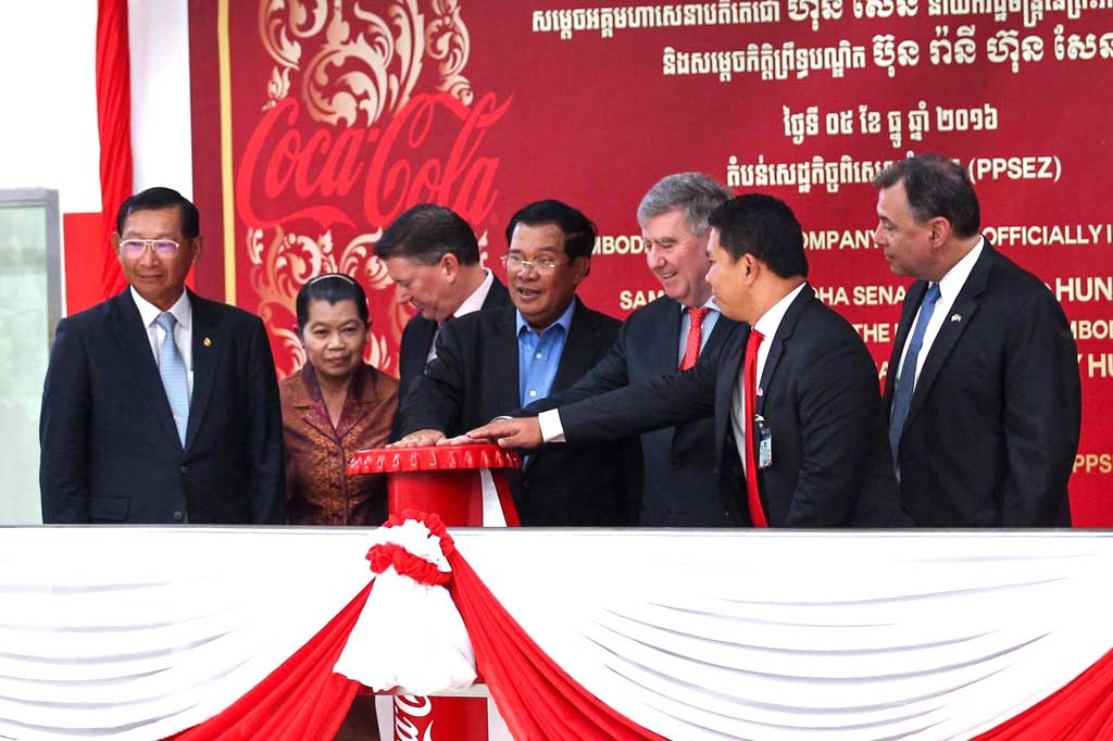 ភ្នំពេញ៖ ប្រមុខរាជរដ្ឋាភិបាលកម្ពុជា សម្តេច ហ៊ុន សែន កាលពីព្រឹកថ្ងៃទី០៥ ខែធ្នូ ឆ្នាំ២០១៦ បានអញ្ជើញចូលរួមផ្តល់កិត្តិយសសម្ពោធរោងចក្រភេសជ្ជៈកូកា-កូឡា (Coca-Cola) ដែល បានវិនិយោគនៅកម្ពុជា តាំងពីឆ្នាំ១៩៩៣ ហើយ ពេលនេះបានវិនិយោគបន្ថែម១០០លានដុល្លារទៀត ដើម្បីបង្កើតរោងចក្រនៅតំបន់សេដ្ឋកិច្ច ពិសេសភ្នំពេញ ។