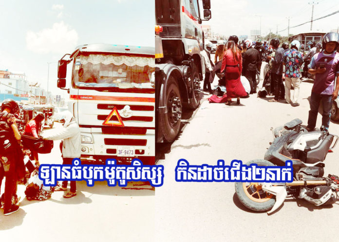 ភ្នំពេញ ៖ យុវជនជាសិស្សសាលាចំនួន ២នាក់ ទើបនឹងចេញពីរៀន ជិះម៉ូតូដឹកគ្នាចេញពីសាលា ស្រាប់តែជួបគ្រោះអកុសល ត្រូវរថយន្តដឹកប្រេង ១គ្រឿង បើកក្នុងល្បឿនយ៉ាងលឿន ជ្រុលមកបុកពីក្រោយ និងថែមទាំងកិនអូសប្រមាណជាង ១០ម៉ែត្រ បណ្តាលឱ្យយុវជនទាំង២នាក់ រងរបួសយ៉ាងធ្ងន់ ដោយម្នាក់ដាច់ជើងម្ខាងត្រឹមភ្លៅ ចំណែកម្នាក់ទៀតដាច់ត្រឹមកជើង និងត្រូវបានបញ្ជូនទៅសង្គ្រោះនៅមន្ទីរពេទ្យភ្លាមៗ។
