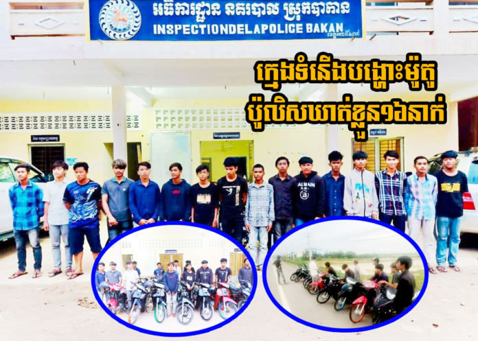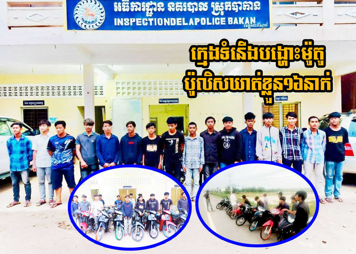 ខេត្តពោធិ៍សាត់ ៖ កម្លាំងនគរបាលស្រុកបាកាន សហការជាមួយកម្លាំងប៉ុស្តិ៍ត្រពាំងជង បានចុះបង្ក្រាបក្រុមក្មេងទំនើង ១ក្រុម ដែលជិះម៉ូតូកែច្នៃខុសបច្ចេកទេស និងបានណាត់គ្នាមកបង្ហោះម៉ូតូ នៅលើដងផ្លូវសាធារណៈ បង្កឱ្យមានការរំខាន និងបង្កការភ័យខ្លាចដល់អ្នកដំណើរ។