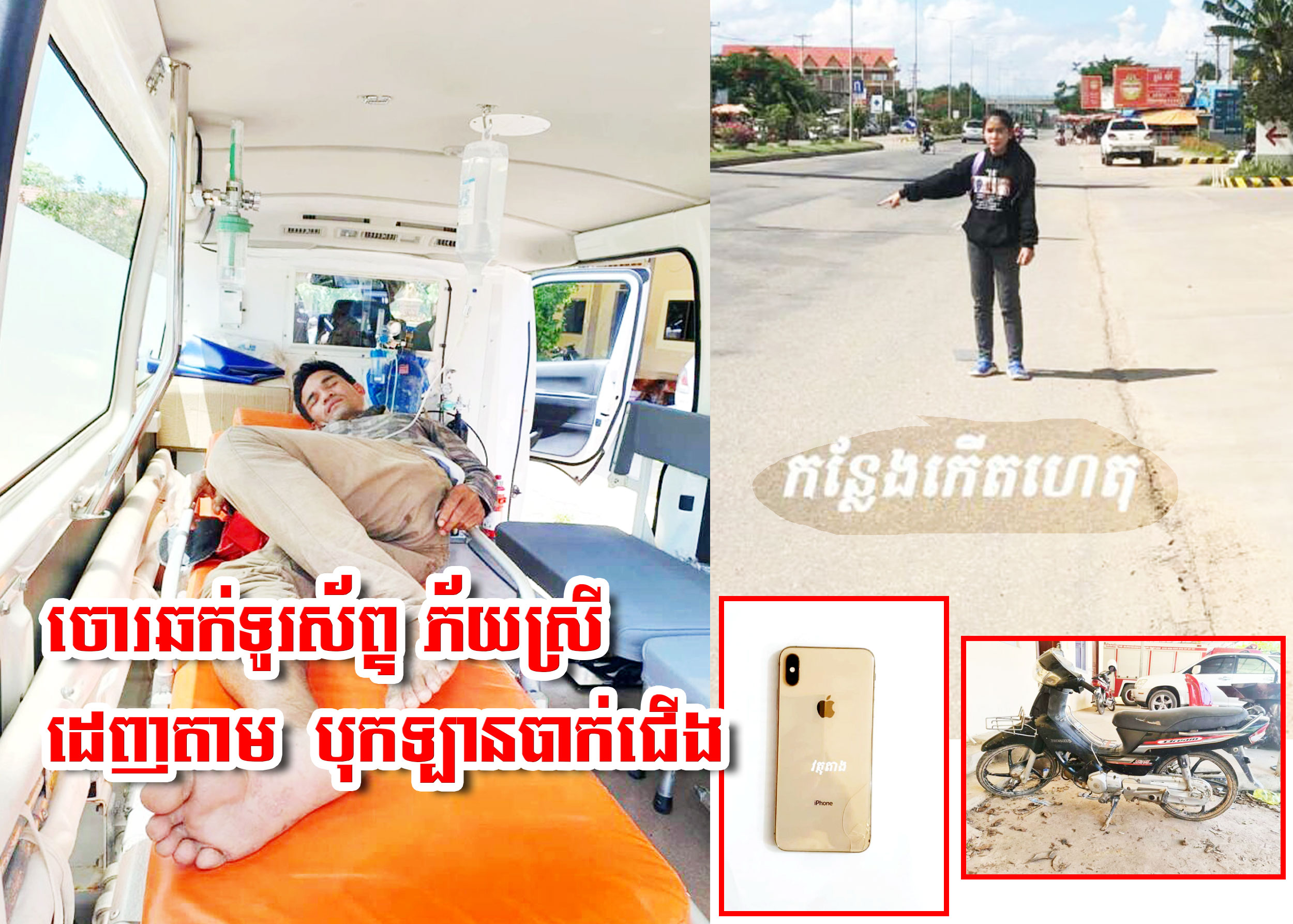 ប្រភពដដែល បន្តថា លុះពេលធ្វើដំណើរជិតដល់ស្ពានព្រែកតាមាក់ ស្រុកមុខកំពូល តាមផ្លូវជាតិលេខ ៦អា ស្រាប់តែលេចមុខជនសង្ស័យម្នាក់ ជិះម៉ូតូ ១គ្រឿង ម៉ាកហុងដា ឌ្រីម សេ១២៥ ស៊េរីឆ្នាំ២០០៨ បានធ្វើសកម្មភាពឆក់យកទូរស័ព្ទរបស់នារីរងគ្រោះ ដែលទុកក្នុងឃ្លុបម៉ូតូ ផ្នែកខាងមុខ ហើយមានបំណងគេចខ្លួន។ តែភ្លាមនេះ នារីរងគ្រោះ បានជិះម៉ូតូប្រដេញតាម ហើយស្រែកថាចោរ!ៗ ដើម្បីឱ្យគេជួយ ពេលនោះ ជនសង្ស័យបានជិះបត់ឆ្លងកាត់ទ្រូងផ្លូវ សំដៅទៅទិសខាងត្បូង ដល់ចំណុចភ្លើងស្តុបកំពង់សាឡាងចាស់ ជនសង្ស័យបានជិះម៉ូតូទៅបុករថយន្តអ្នកធ្វើដំណើរ បណ្តាលឱ្យដួលបាក់ជើងខាងស្តាំ ទៅមុខលែងរួចតែម្តង។