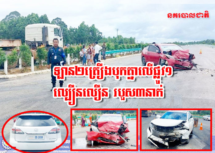 ខេត្តព្រះសីហនុ ៖ រថយន្តទំនើបចំនួន ២គ្រឿង បើកបរនៅលើផ្លូវល្បឿនលឿន ដោយប្រើប្រាស់ល្បឿនលឿនដូចគ្នា រួចក៏ជ្រុលបុកគ្នា ចំពីមុខយ៉ាងពេញទំហឹង បណ្តាលឱ្យមនុស្សចំនួន ៣នាក់ទទួលរងរបួស ចំណែករថយន្ត រងការខូចខាតផ្នែកខាងមុខយ៉ាងដំណំដូចគ្នា។