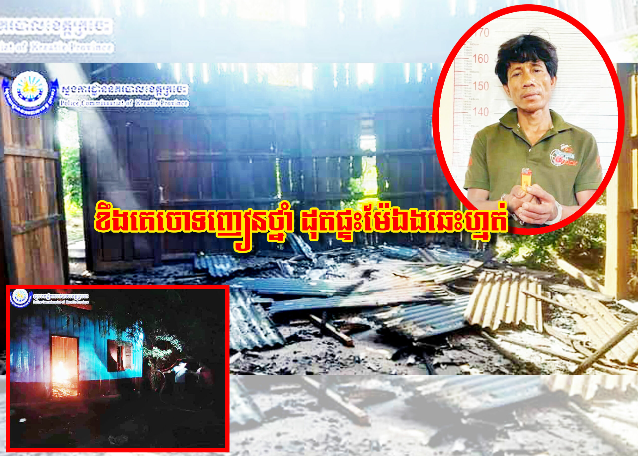 ខេត្តក្រចេះ ៖ បុរសជាជនជាតិខ្មែរអ៊ិស្លាមម្នាក់ ខឹងសម្បាជាមួយនឹងអ្នកជិតខាងដែលចេះតែនិយាយចោទប្រកាន់មកលើខ្លួនថា ជាមនុស្សញៀនថ្នាំ បែរជាមួម៉ៅក្តៅចិត្ត ធ្វើសកម្មភាពដុតផ្ទះម្តាយបង្កើតខ្លួនឯង បណ្តាលឱ្យឆេះអស់គ្មានសល់ ទីបំផុតត្រូវស្ត្រីជាម្តាយទ្រាំលែងបាន ប្តឹងសមត្ថកិច្ចឱ្យចាប់ខ្លួនកូនប្រុសនេះ នាំយកទៅចាត់ការតាមច្បាប់។